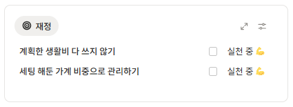 그렇게 나눈 사용처는 모임 회비, 연금 펀드, 청약, 적금, 주식, 생활비 등인데, 사실상 생활비를 제외하곤 나에겐 거의 고정비에 가까운 것들이다. 그래서 여기에 '계획한 생활비 다 쓰지 않기'라는 목표를 하나 더 추가했다. 정해진 생활비를 초과하여 다른 카테고리의 돈을 가져오는 일을 방지하기 위해서다. 내가 설정한 카테고리들이 꼭 지불해야 하는 빚 같은 존재는 아니기에 마음만 먹으면 당겨올 수 있는 돈이라, 경각심을 갖고자 추가한 목표라 할 수 있다.