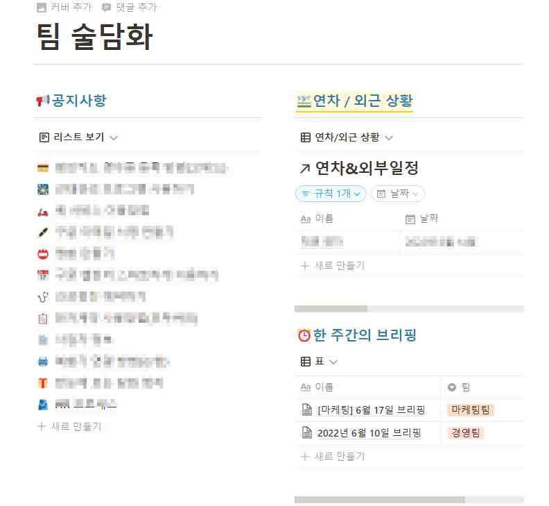 술담화는 노션으로 프로젝트나 업무를 관리한다. 노션으로 업무를 관리하게 된지는 이제 1년이 조금 넘어가는 것 같은데, 노션을 처음 사용할 당시 페이지를 기획하고 구축했던 사람이 바로 나다. 난 사실 이 회사에 와서 노션이란 것을 처음 알게 됐다. 그런 나에게 왜 노션 업무가 떨어졌는지는 모르겠으나... 하라니깐 하게 됐고, 하다 보니 재밌어서 열정을 붓게 됐다.