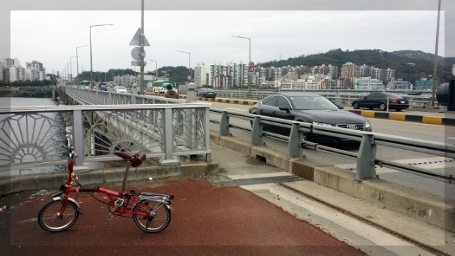 영동대교도 강북쪽, 강남쪽 모두 계단을 이용해야 합니다. 계단 경사가 제법되기 때문에 끌바의 난이도가 좀 있습니다. 진입 자체는 나쁘지 않은 편입니다. 도로 폭은 좁습니다. 도로상태도 아주 나쁘지 않지만 좋은 편은 아닙니다. 강과 도로 쪽 모두 가드레일과 난간의 안정감은 높지 않습니다. 하지만 의외로 심리적 불안감은 좀 덜한 편입니다. 보행자가 많은 편입니다.
