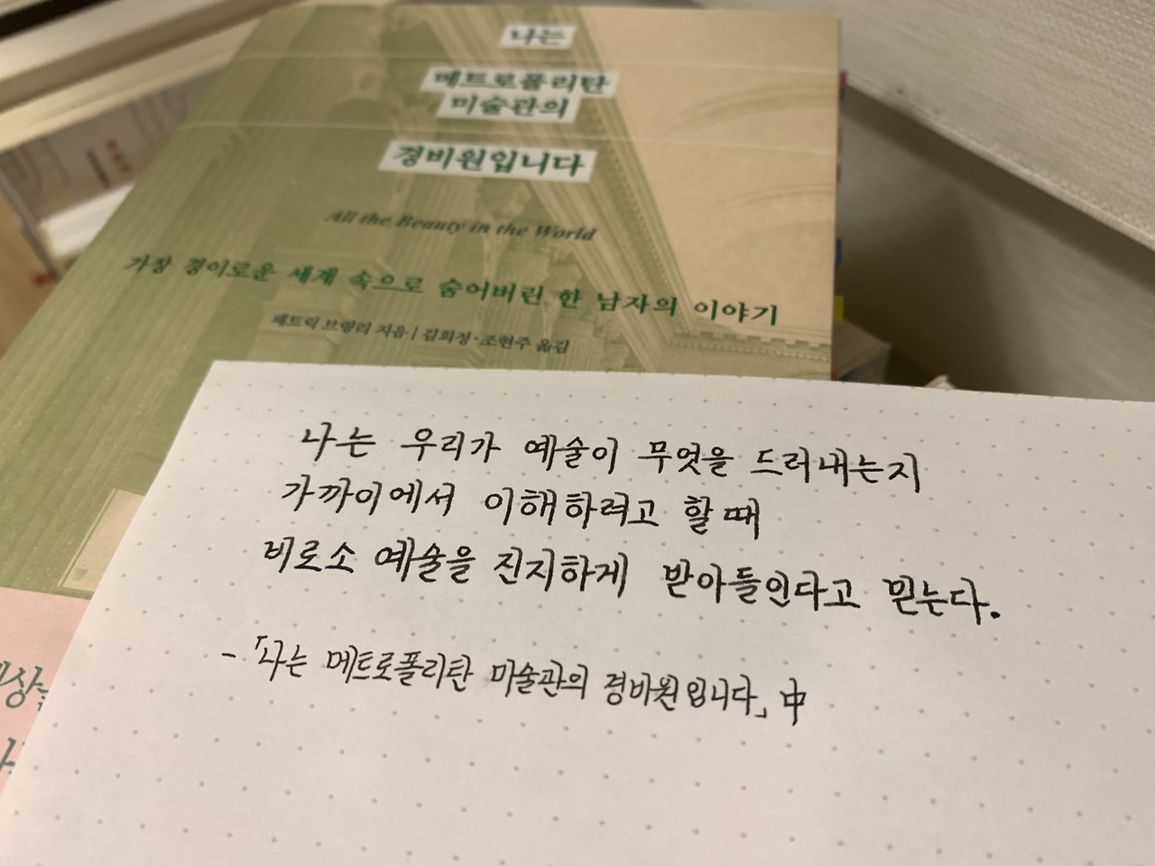 예술을 진지하게 받아들인다는 말을 저는 '주체적으로 받아들인다'로 해석합니다. 이렇게 저렇게, 요모조모 작품을 감상하면서, 작품을 바라보는 '내 눈의 해상도'를 높이면, 나만의 느낌이나 감상이 느껴집니다. 그렇게 자기만의 느낌과 감상으로 삶을 더욱 단단하게 만들어 나간 한 사람의 이야기가 <나는 메트로폴리탄 미술관의 경비원입니다>에 있습니다.