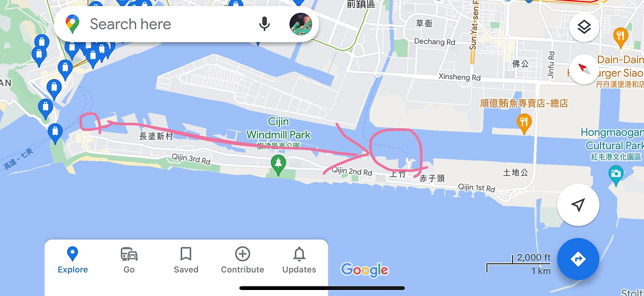그렇게 3시간을 걸었다. 모르겠다. 가오슝에 오면 필수로 들려야 하는 코스라는데, 이게 맞나? 조금 더 예쁜 곳이 나올 것이라 기대하며 걸었다. 조금만 더, 조금만 더. 그런데 바다는 어디서 보나 그 장면이 그 장면이다. 점점 감흥이 떨어진다. 왔던 길로 돌아가기에는 아쉬웠다. 이런 걸 매몰비용이라 하나. 오기로 그냥 계속 걸었다. 구글맵을 검색해보니 타고 온 페리 선착장 말고 앞으로 더 걸으면 다른 선착장이 있었다. 그걸 타고 가야지. 목표가 생기니 조금 기운이 났다.