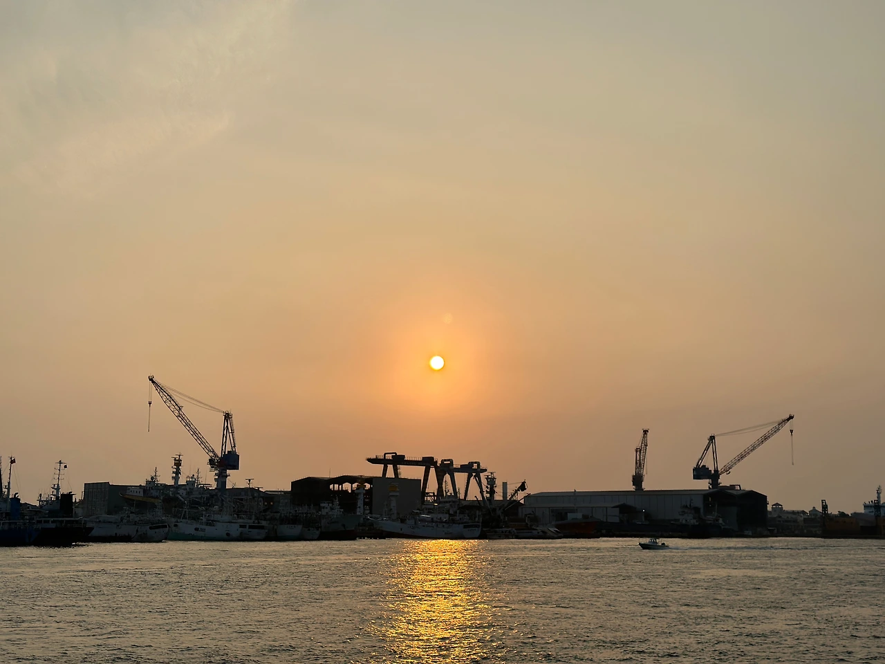배 위에서 보는 일몰이 예뻤다. 내가 걸어온 쪽은 배를 만드는 조선소들이 몰려있는 곳인 듯했다. 페리를 타고 나가는 중에야 알았다.