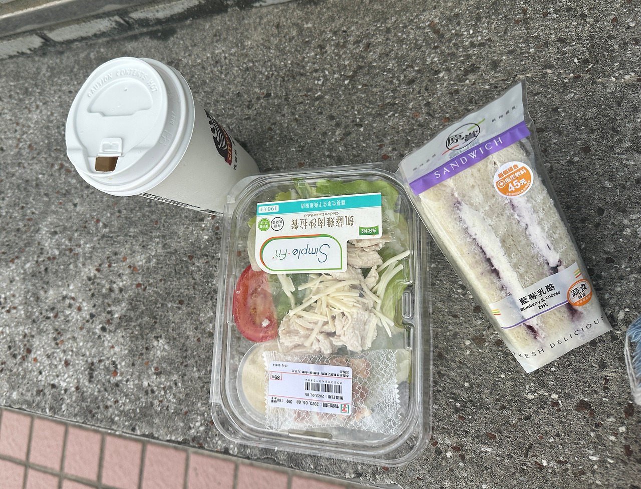 나의 대만 최애 음식, 옌마이나티에(오트라테)와 샐러드 그리고 블루베리치즈 샌드위치. 그런데 이 세븐일레븐에서 타주는 라테는 맛이 없다. 다른 지점보다 밍밍한 것 같다. 그래도 주변에 세븐일레븐이 여기 한 곳이라 다른 선택지가 없다. 블루베리치즈 샌드위치는 그냥 흰 식빵에 잼이랑 크림치즈를 발라준 것인데 나름 맛있다. 샐러드는 언제나 평타는 친다.