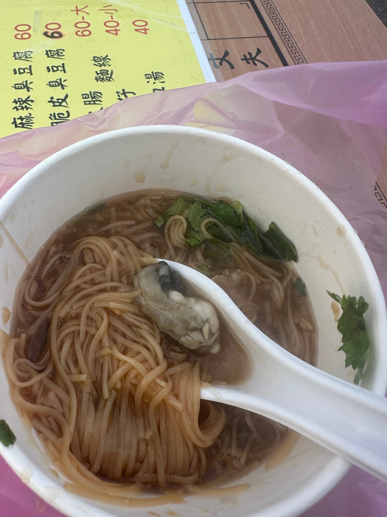 그렇게 야시장에 도착. 딱히 당기는 게 없어서 이리저리 빙빙 돌다가 궁금한 국수 발견. 작은 컵 하나를 시켰다. 국수에 곱창과 굴 몇 개를 넣어주었다. 맛은 심심한 간장맛. 은근 중독성 있다. 한 그릇 다 비웠다. 가격은 40위안.