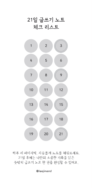 습관 형성에는 최소 21일의 꾸준함이 필요하다고 합니다. 작심삼일이 일곱 번이면 21일이지요. 매일매일 노트에 세 페이지를 쓰고 챌린지 보드에 하나씩 체크를 하다 보면 내가 얼마나 왔는지, 또 얼마나 가야 하는지를 한눈에 알아볼 수 있어 좋습니다.