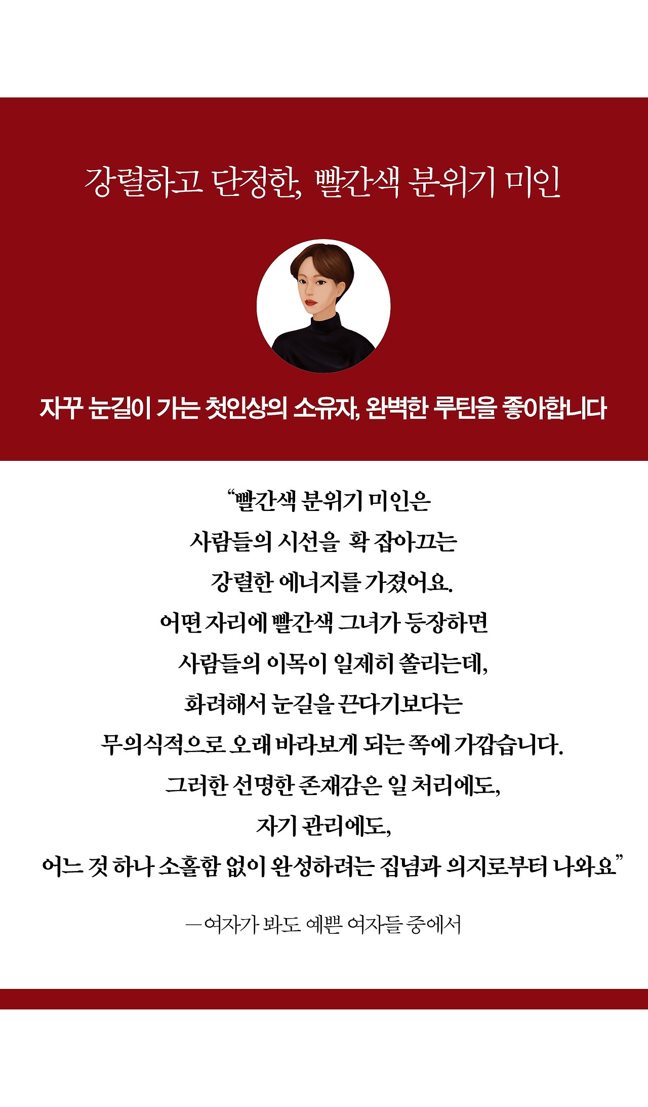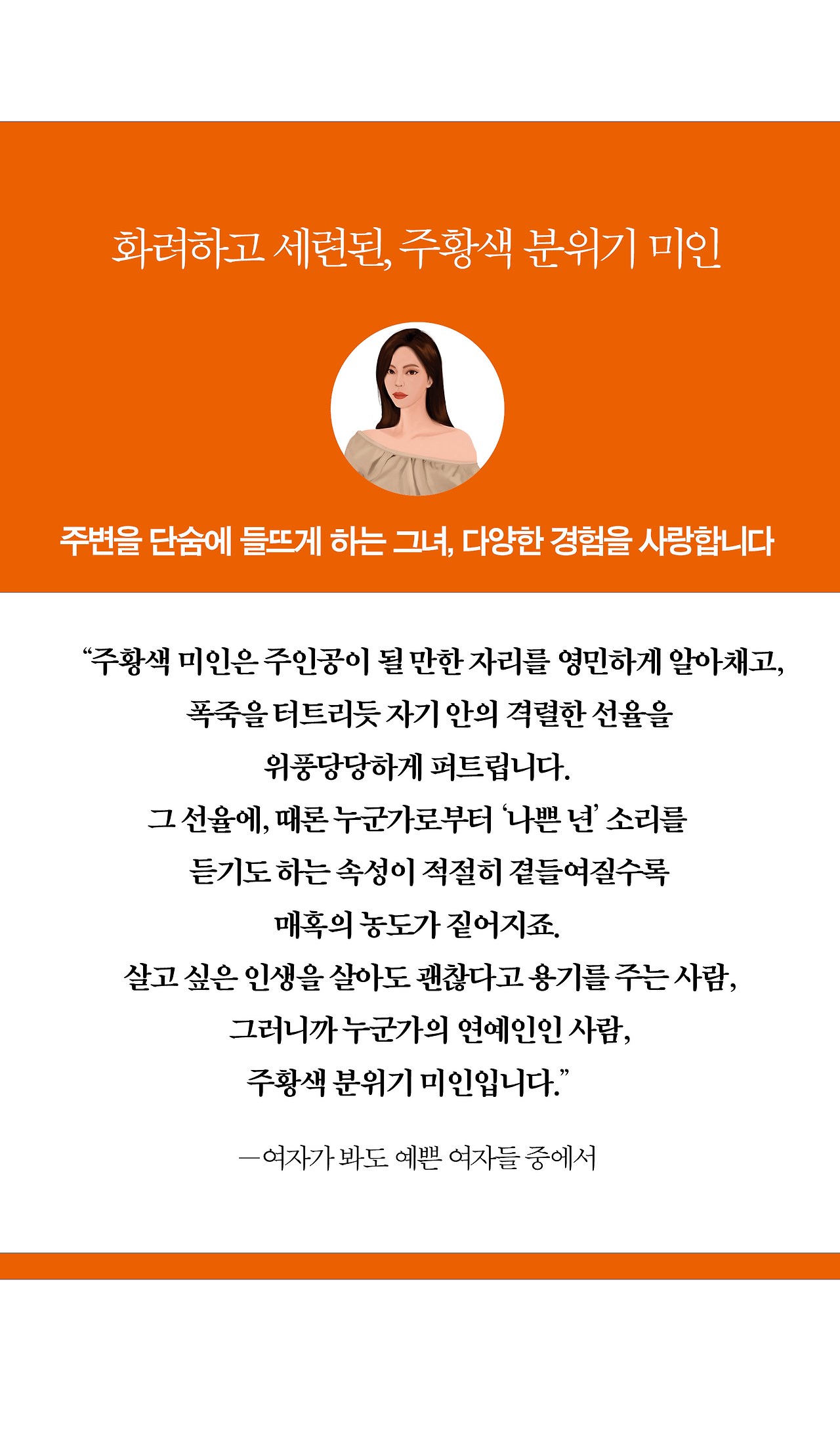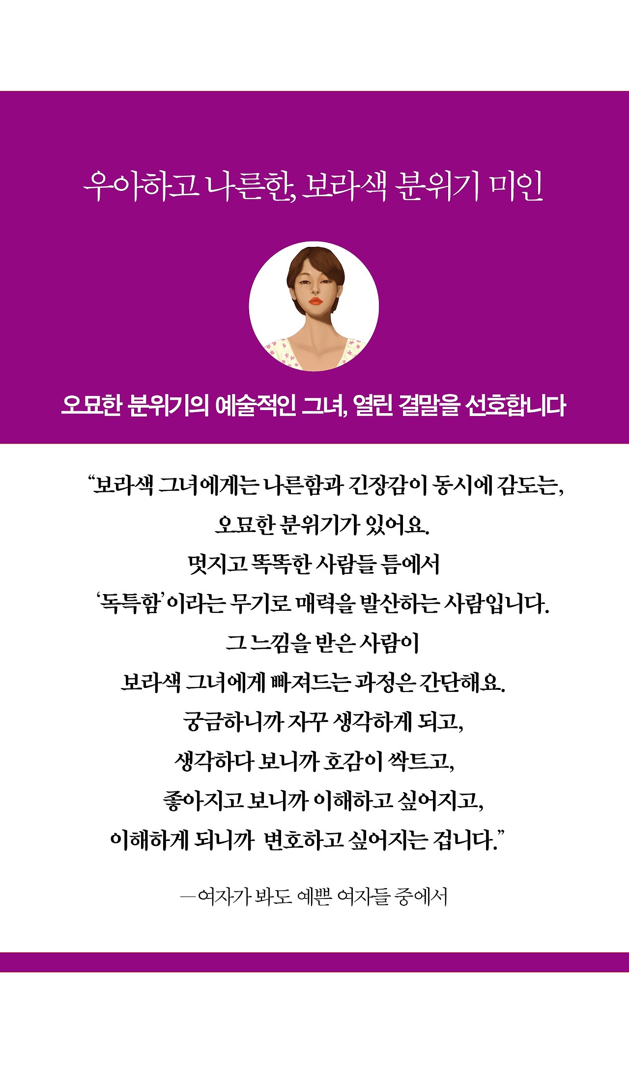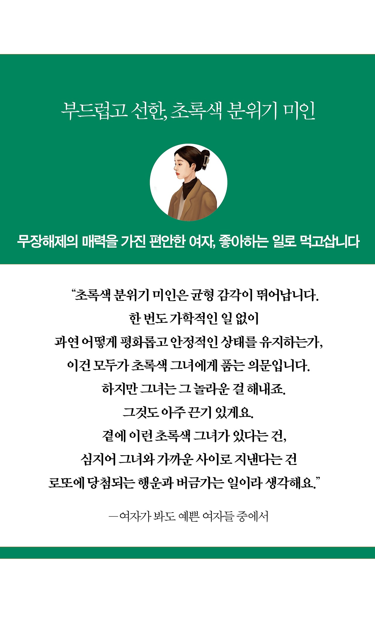 분위기 미인이라는 게, 깨끗한 피부나 저칼로리 요리 같이 비교적 간단하게 이해할 수 있는 개념이 아니라서, 설명하기를 포기하고 싶었는데요. 그럼에도 저는 이 개념을 알아가려고 시간을 할애 하다보면 실질적인 이득이 생긴다는 걸, 경험했거든요. 그래서 고민 끝에 설명하기보다는 보여주는 방식을 선택했습니다. 제가 가진 것 중 가장 개인적인 것 ― 일기장에 숨겨둔 분위기 미인들의 내밀한 일상이 담긴 이야기를, 가능한 한 생생하게 들려드릴게요. 고려대 심리학과 박선웅 교수님은 저서 「정체성의 심리학」에서 한 사람을 알기 위해 필요한 건 명사가 아니라 이야기라고 했습니다. 저 사람은 어디 사는 사람, 저 사람은 어느 직장에 다니는 사람. 저 사람은 무슨 차를 타고 다니는 사람 같은 명사로는 누구도 규정할 수 없다는 거죠. 대신 그 사람의 인생 이야기를 들으면 똑같이 의사가 되고 싶어 하더라도 그 개인의 이유를 알 수 있다고요. 제 생각엔 그 이유를 직관적으로 보여주는 것이 바로 개인이 내뿜는 분위기입니다. 그것은 뭐라 선뜻 설명하긴 힘들지만, 분명히 느껴지고, 또 대단한 영향력까지 가졌죠.