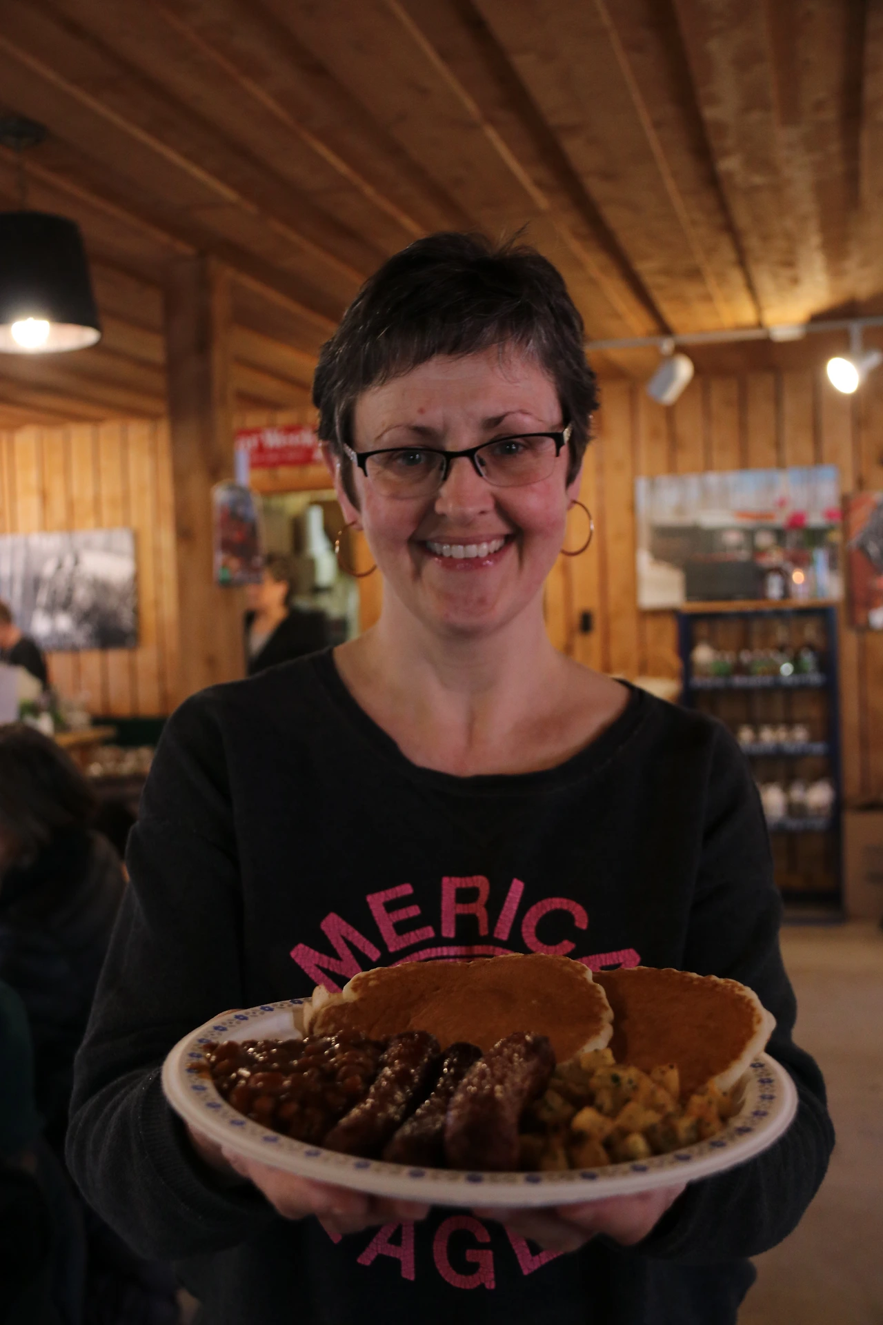 (좌) 버터밀크 팬케이크를 서빙하고 있는 Sandy Flat Sugar Bush의 오너, 로빈(Robin), (우) 버터밀크 팬케이크