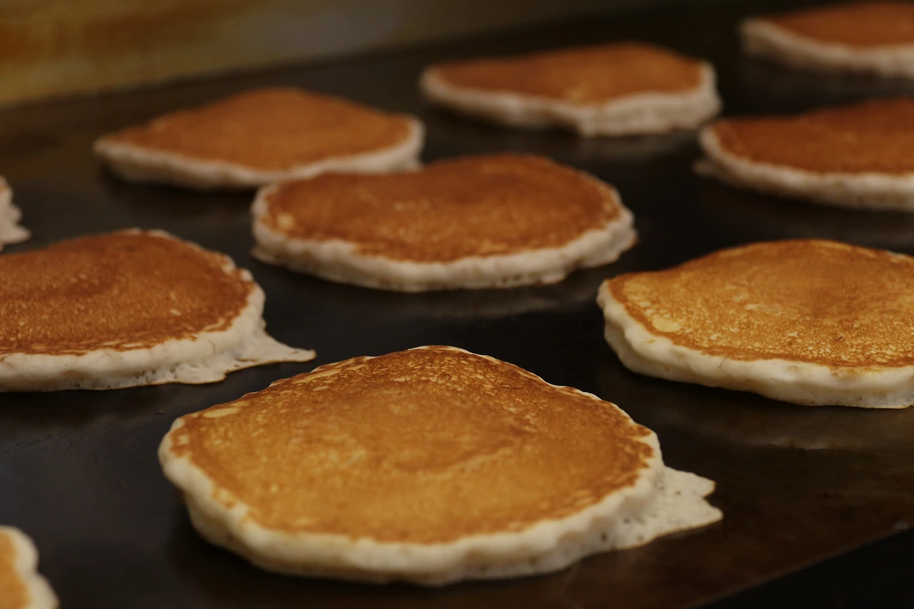 팬케이크 텐트에서 팬케이크를 만들고 있는 자원봉사자들