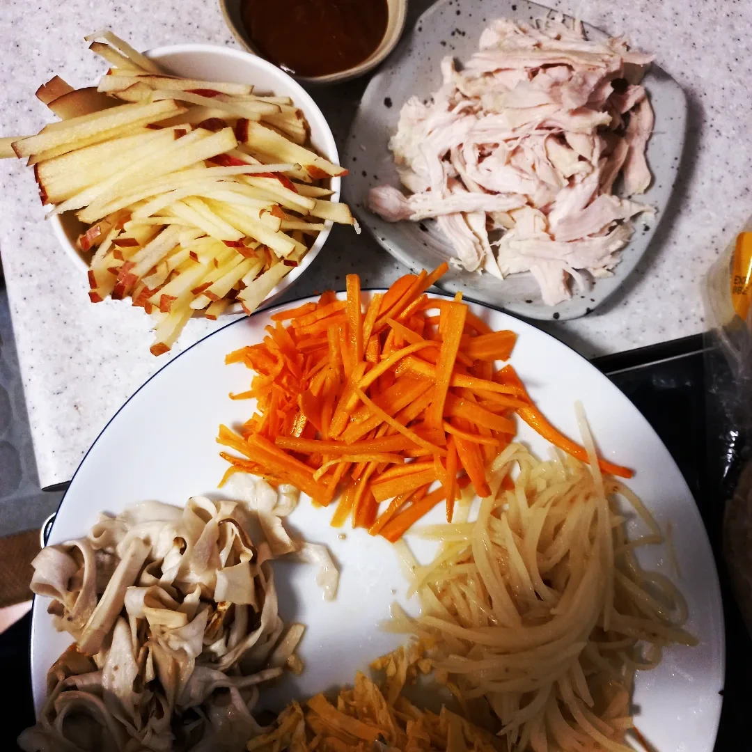 닭가슴살. 당근. 감자. 새송이. 사과. 양파 후레이크.