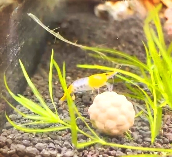 반려새우 '오렌지릴리'가 먹이 위에 앉아있다