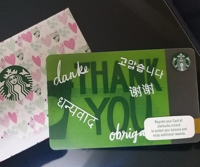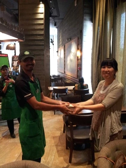 첸나이 스타벅스 1호점, 선물용으로 다량의 바우처를 구입했더니 굳이 저렇게 기념 촬영을 당했다(?). 기프트카드에 '고맙습니다'라고 한글도 적혀있다.