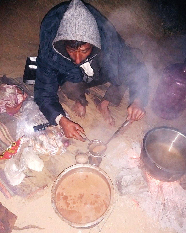 라자스탄, 자이살메르 사막에서의 1박 후 새벽, 짜이를 끓이는 사막인.