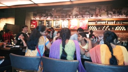인도 첸나이 스타벅스 풍경. 전통 복장을 입은 여대생들과 스타벅스, 현재의 첸나이를 설명하는 모습이다.
