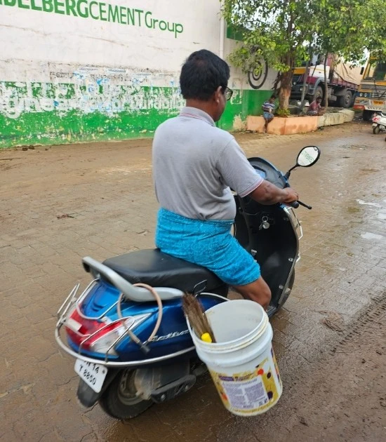 오토바이를 타고 있었고, 오토바아에는 양동이가 달렸고, 그 양동이 안에는 빗자루와 솔이 담겨있었다. 인도 전통복장인 짧은 치마까지 입고 있어서 도저히 목사님이라고 인지가 되지 않았다.