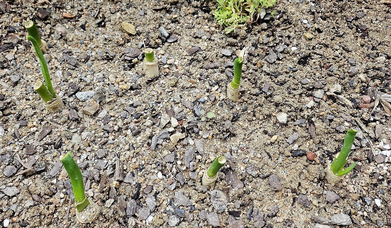대파 한 단을 사서 3등분으로 잘라서 비닐팩에 담아 냉장고에 보관하고 뿌리는 또 텃밭에 심어놓았다. 며칠 비가 오더니 초록 싹이 쑥 올라왔다.