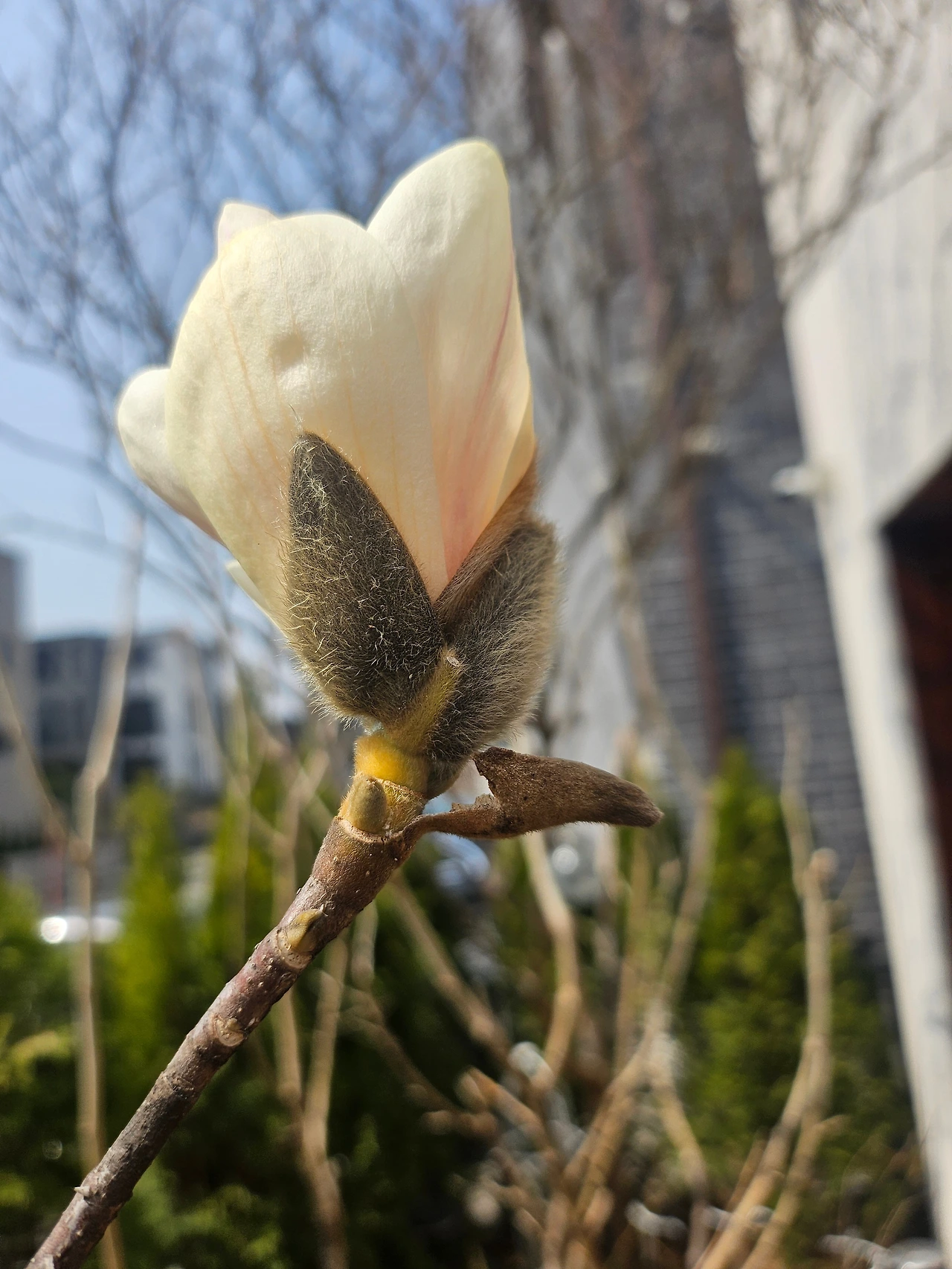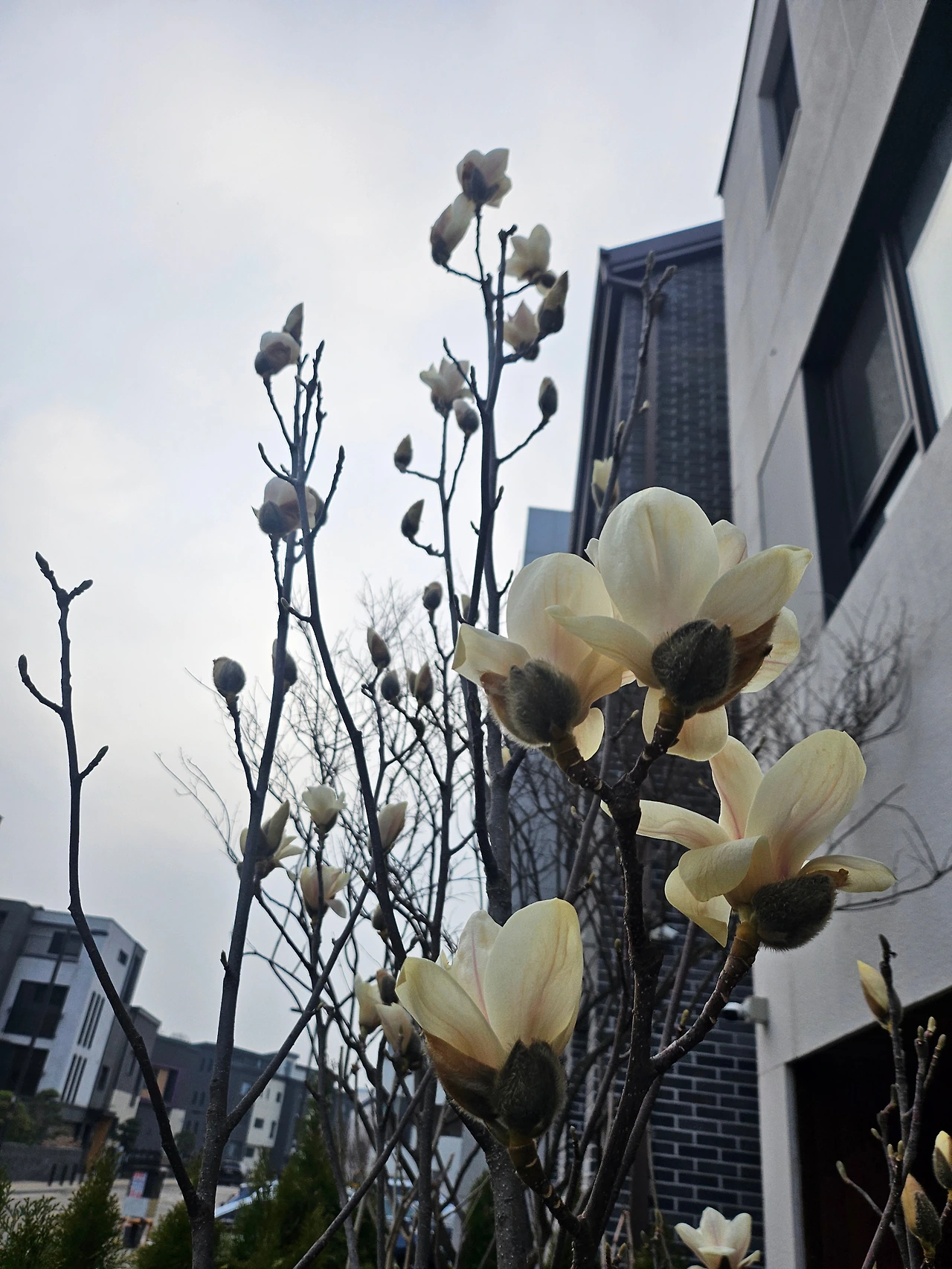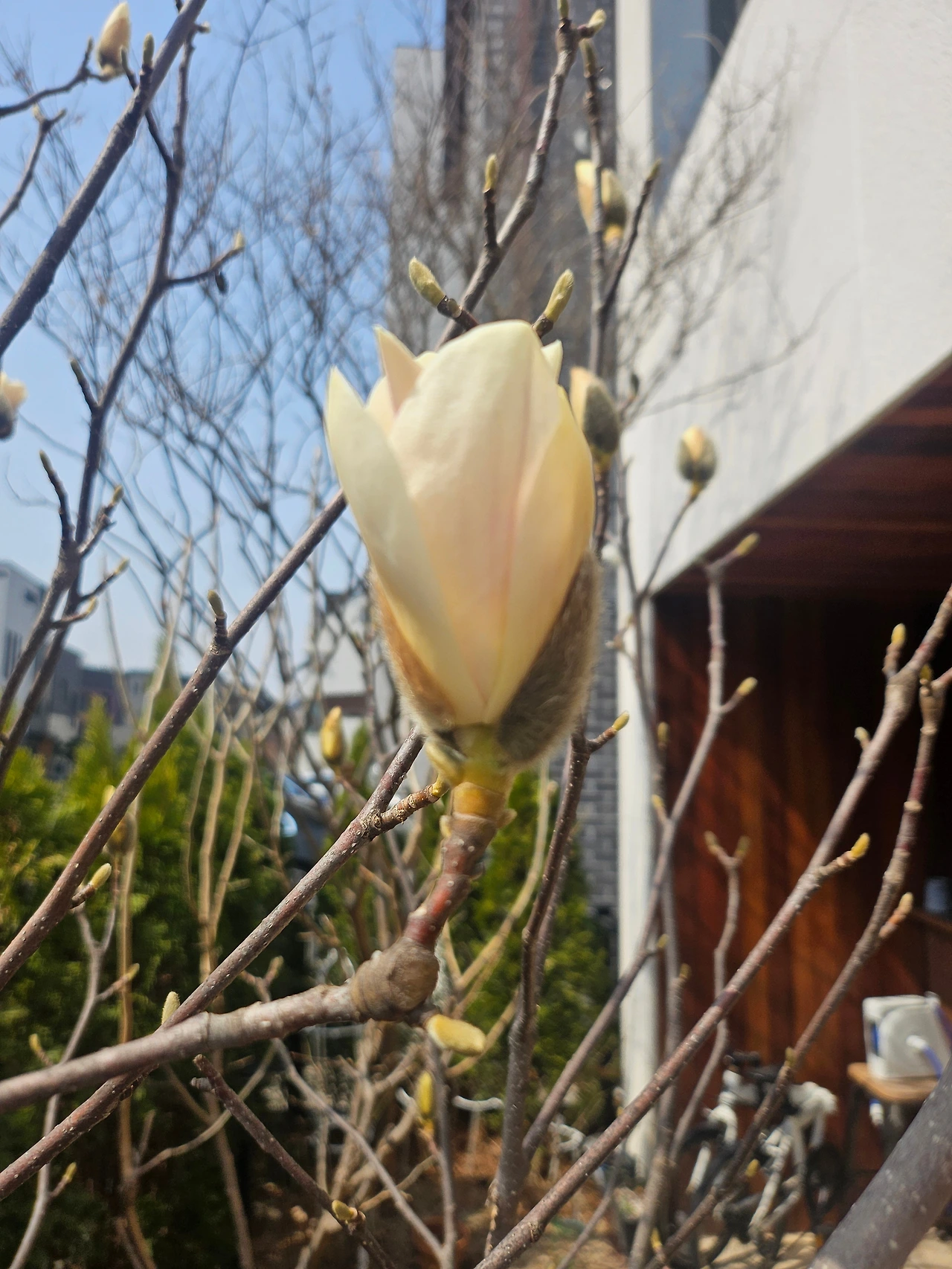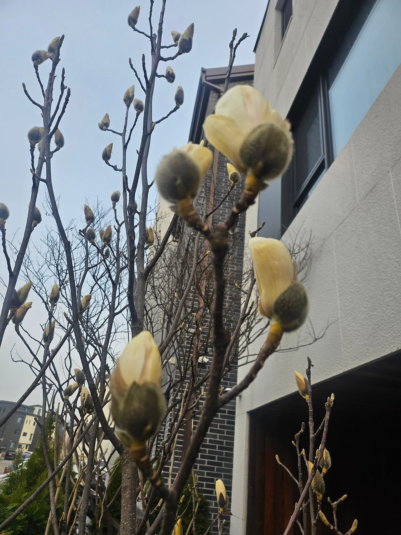 옆집, 윗집 정원에도 목련나무가 있지만, 그 두 집은 아직 한겨울처럼 겨울꽃눈이 꽁꽁 감싸져 있는데, 신기하게 우리 집 목련만 유독 급한 일이라도 있는 듯이, 중요한 일이라도 있는 듯이, 그래야만 하는 이유라도 있는 듯이 부지런히 꽃망울을 터뜨려주었다.