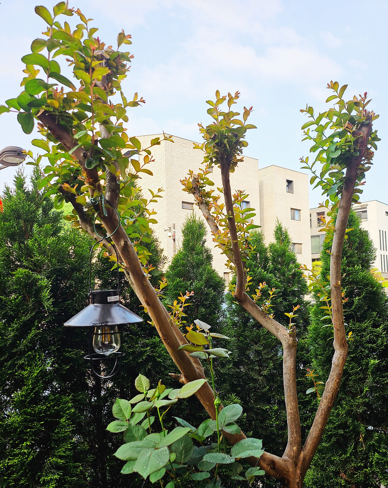 무엇보다 놀란 것은 배롱나무였다. 가지치기를 하고 작은 새순이 올라온 나무를 매일 관찰을 했고, 여행을 떠나던 아침에도 언제나 가지가 자랄까 싶어서 아직은 몇 개 안 되는 새 잎을 봤었는데, 나무 기둥 아래부터 가지 끝까지 작은 잎들이 빼곡히 돋아나 있었다.