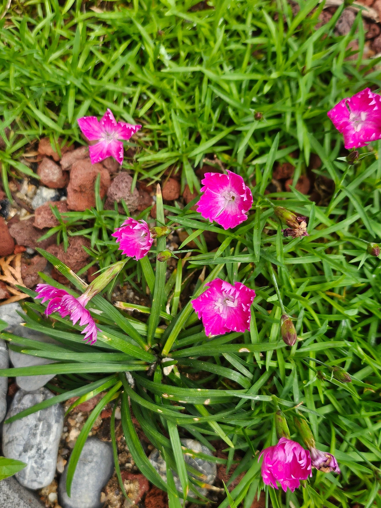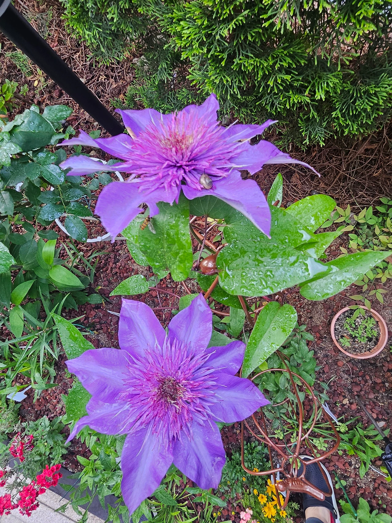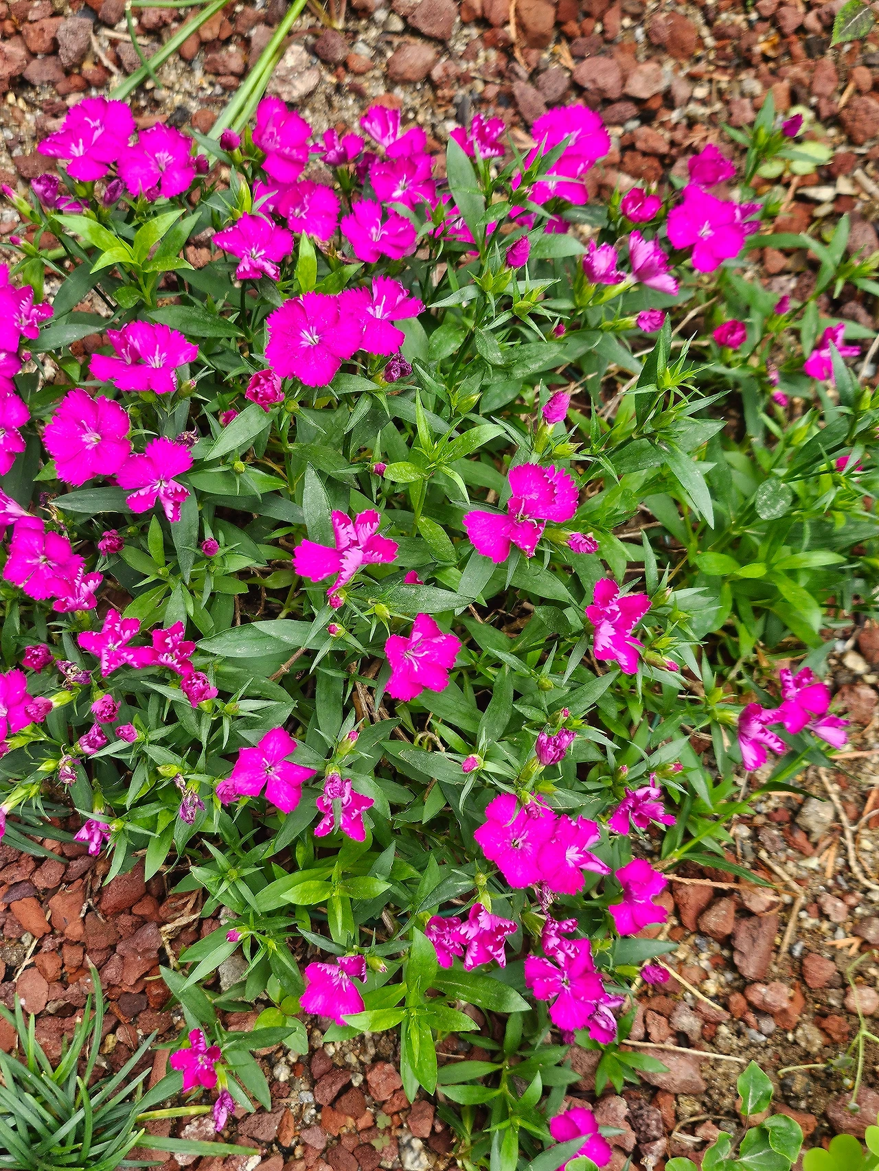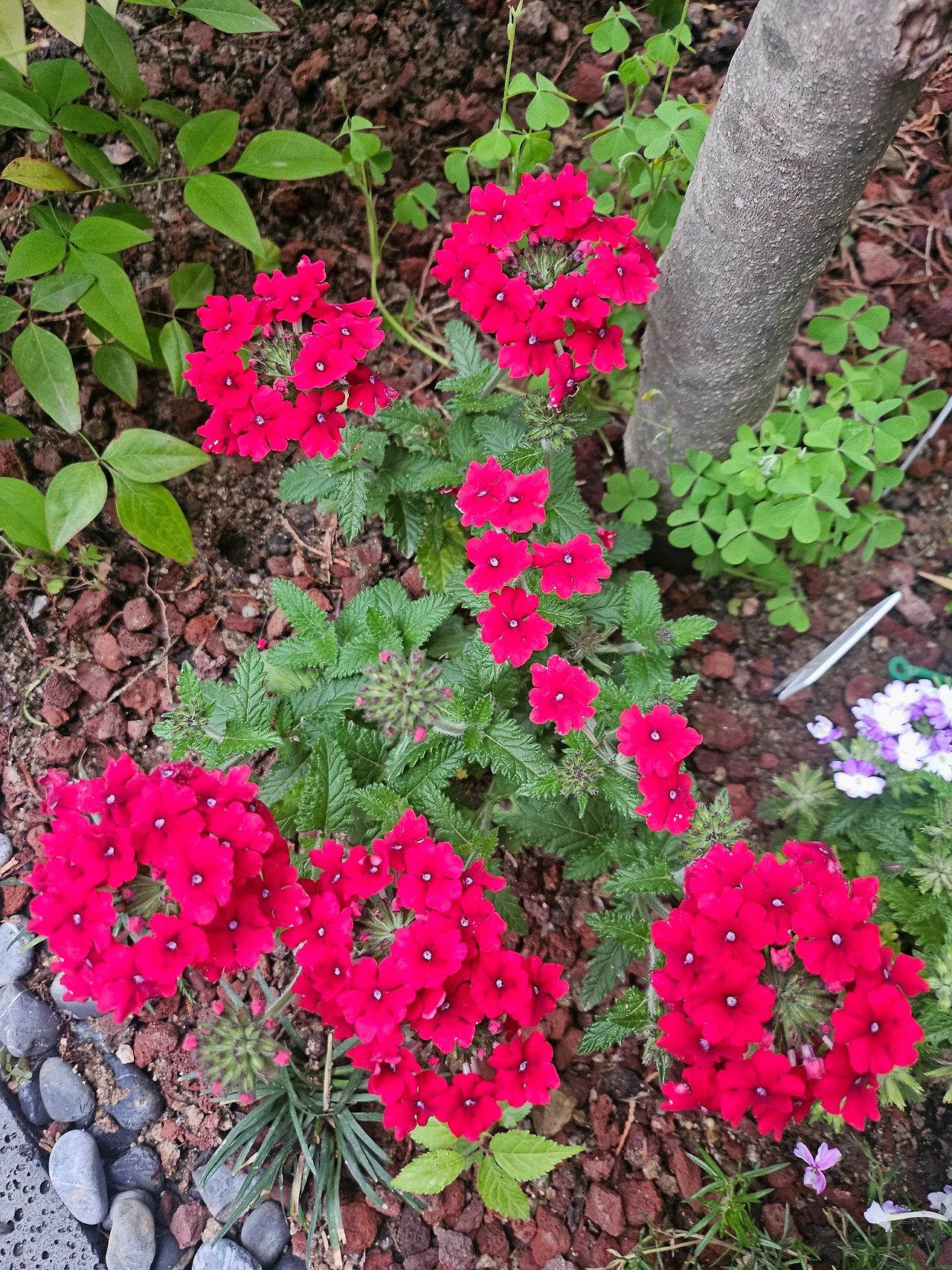 보라색 커다란 으아리 꽃이 접시처럼 납작하게 펼쳐져 있었고, 진분홍 사계 패랭이가 눈이 부시게 작은 꽃들을 무수히 내놓고 있었고, 한 달 내내 봉우리만 보였던 빨간색 버베나 작은 꽃이 옹기종기 모여서 강렬하게 펴있었다. 노란색 비덴스는 키도 훌쩍 자라서 꽃송이도 여러 개로 늘어나 있었고, 초록잎만 있었던 난쟁이 패랭이도 수줍게 작고 진한 분홍꽃을 귀엽게 보여줬다. 안 보이던 장미 꽃봉오리가 보였고, 백합과 나리는 부쩍 키가 컸고, 시들하던 남천은 초록 새 잎으로 건재하다고 알렸고, 수국은 잎이 더 풍성해져 있었다.