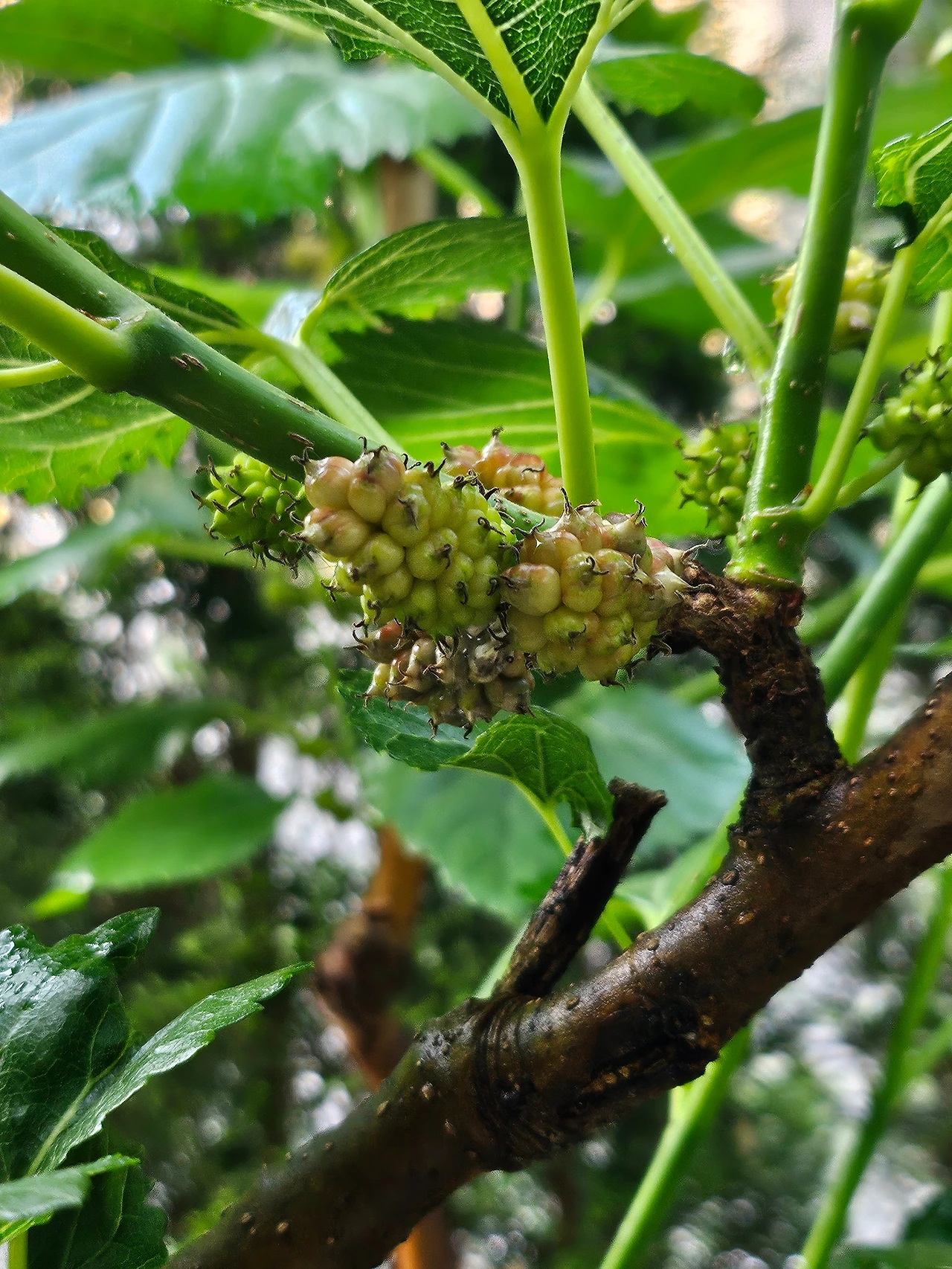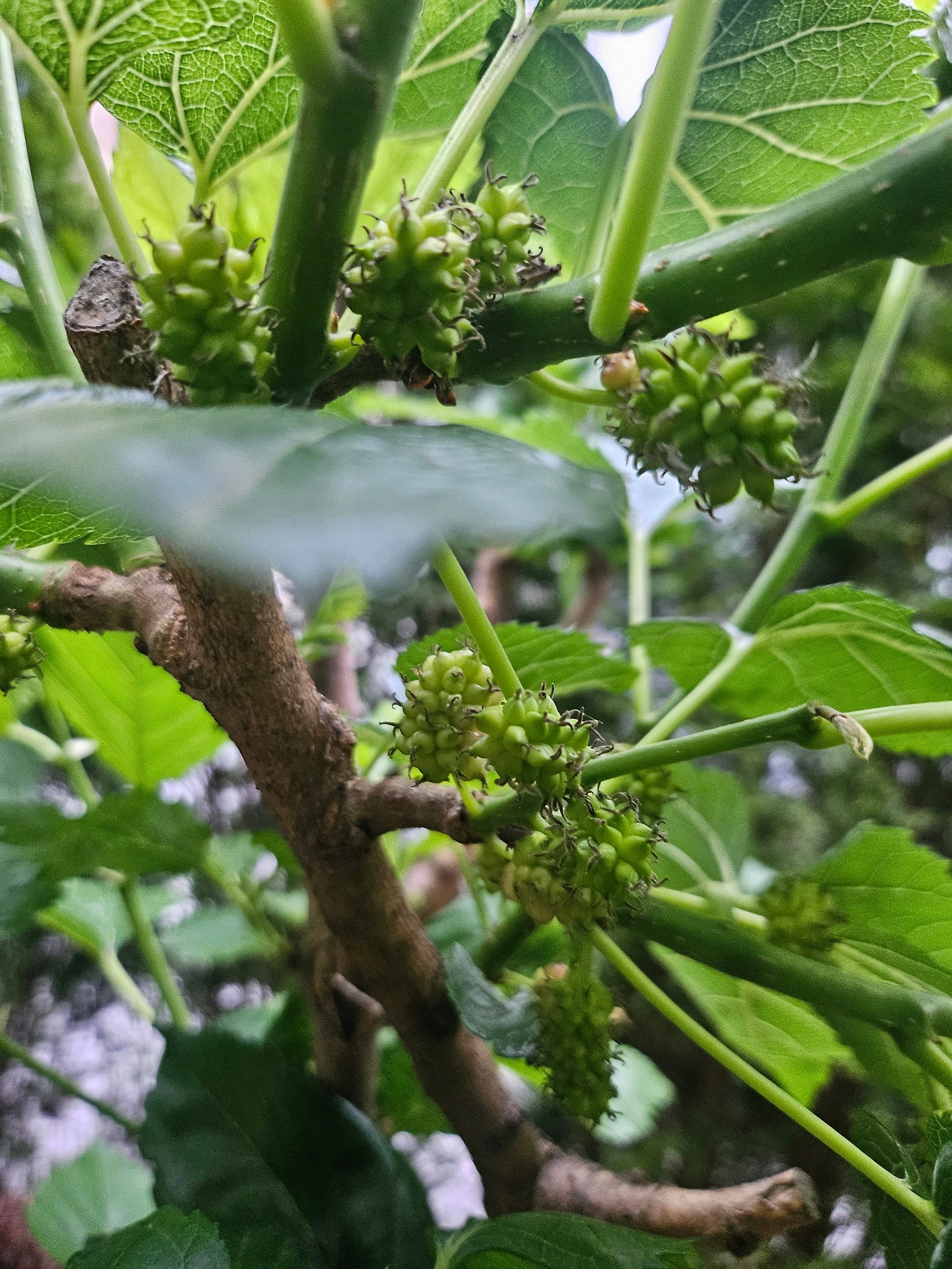 씨 뿌린 상추, 깻잎은 키가 부쩍 커졌고, 고추 모종에 작고 귀여운 꽃이 여러 개 달렸다. 가지치기를 해서 너무 작은 옷을 입은 듯했던 뽕나무는 놀랄 만큼 가지가 자라서 잎이 무성해졌고, 오디도 제법 굵어지고 있었다.