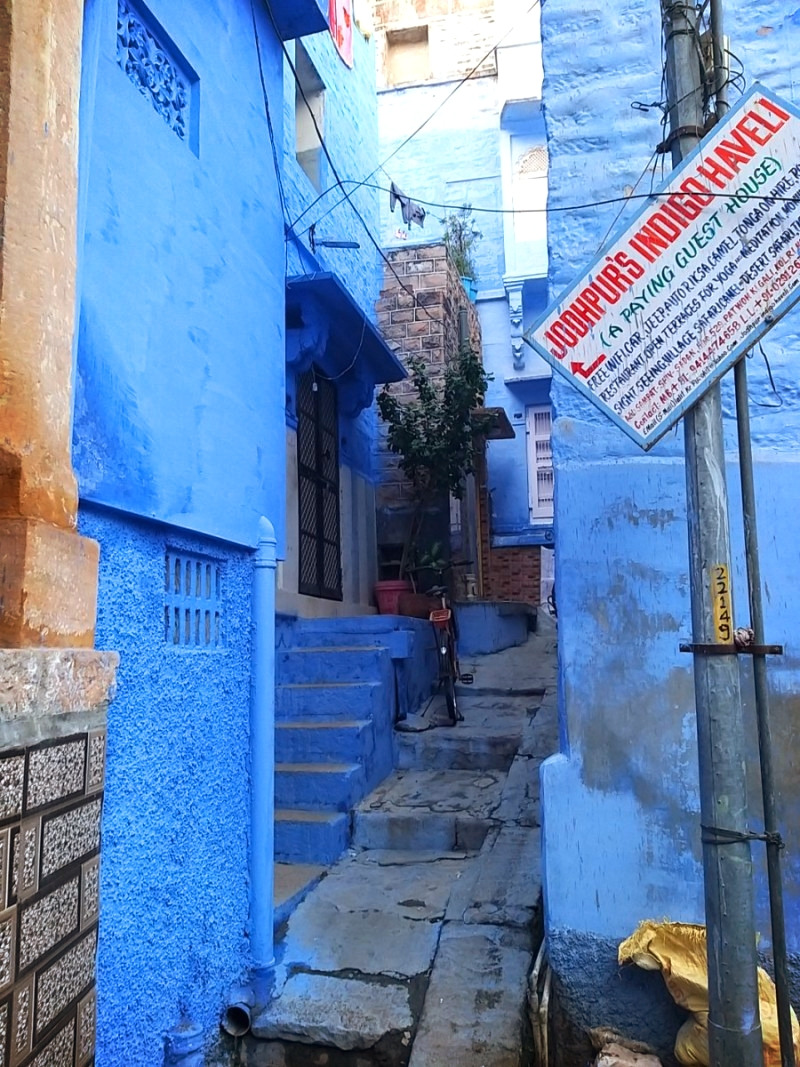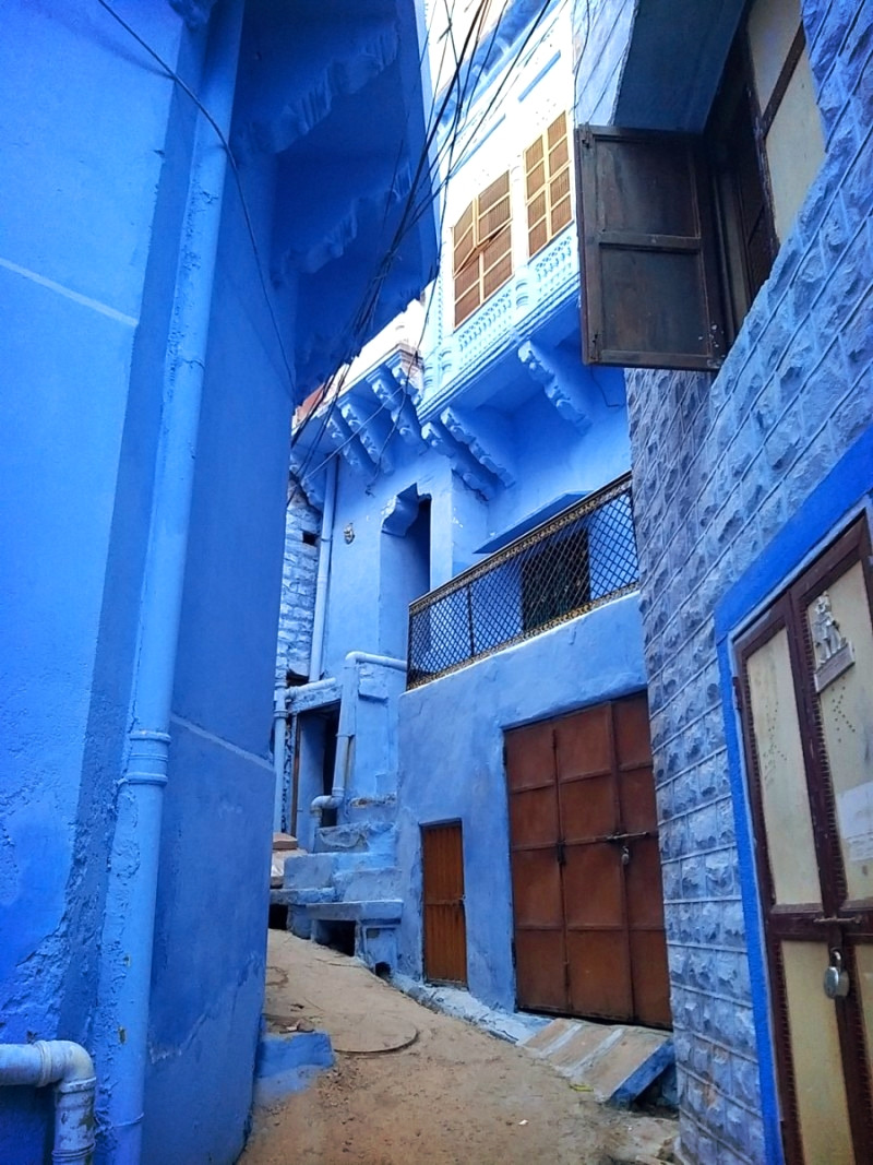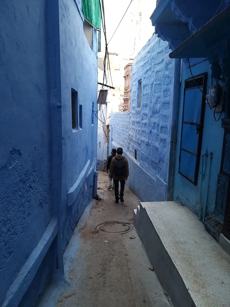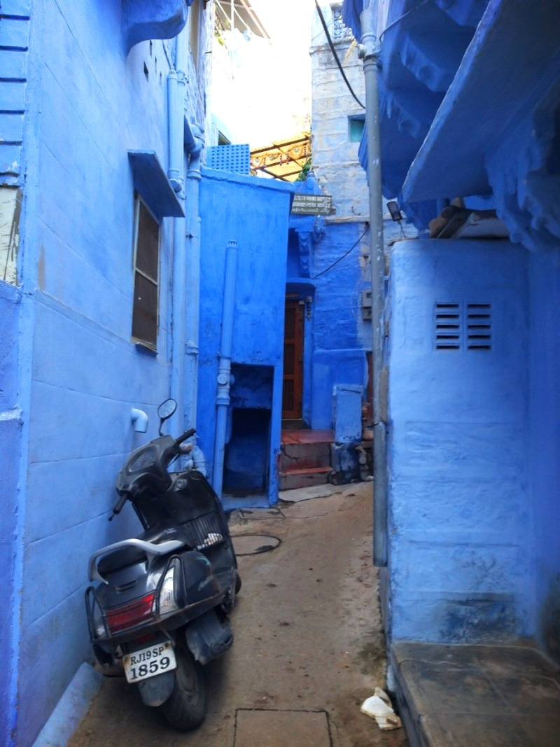 짐을 풀고 호텔을 찬찬히 둘러봤다. 분수대도 있고, 수영장도 있는 꽤 규모가 큰 주택이었다. 모든 바닥은 작은 타일로 모양을 냈고, 눈을 들면 메헤랑가르 성이 보이는 호텔의 루프탑은 아침에는 커피 한잔, 밤에는 맥주 한잔 하기에 그만일 것 같았다. 호텔을 둘러보면서 계단을 걸어 내려왔다. 어두워지기 전에 블루시티 골목을 걸어보려고 호텔 밖으로 나왔다.