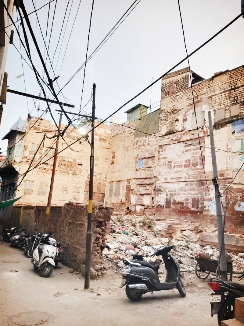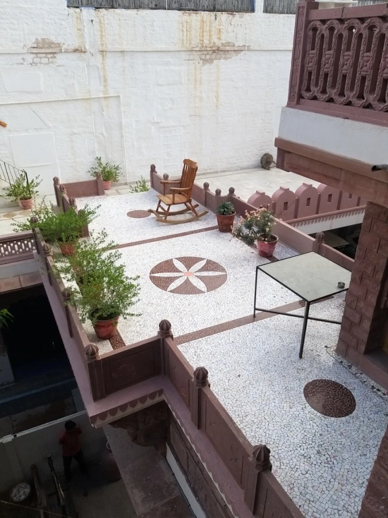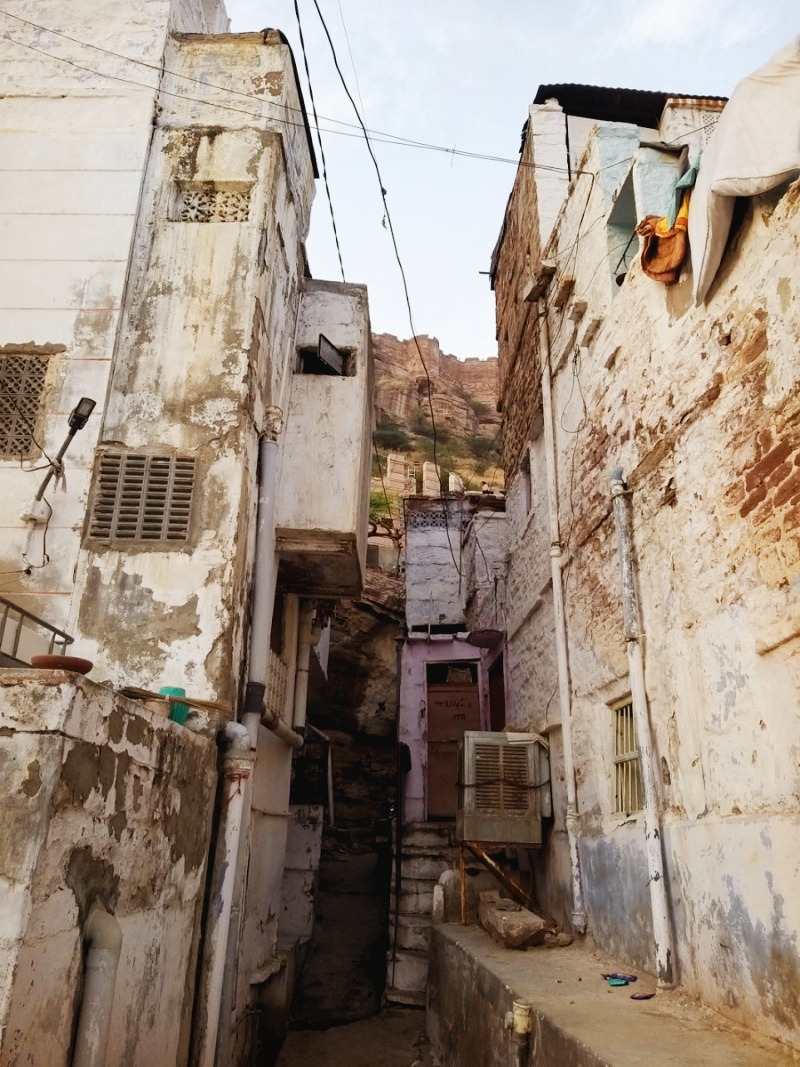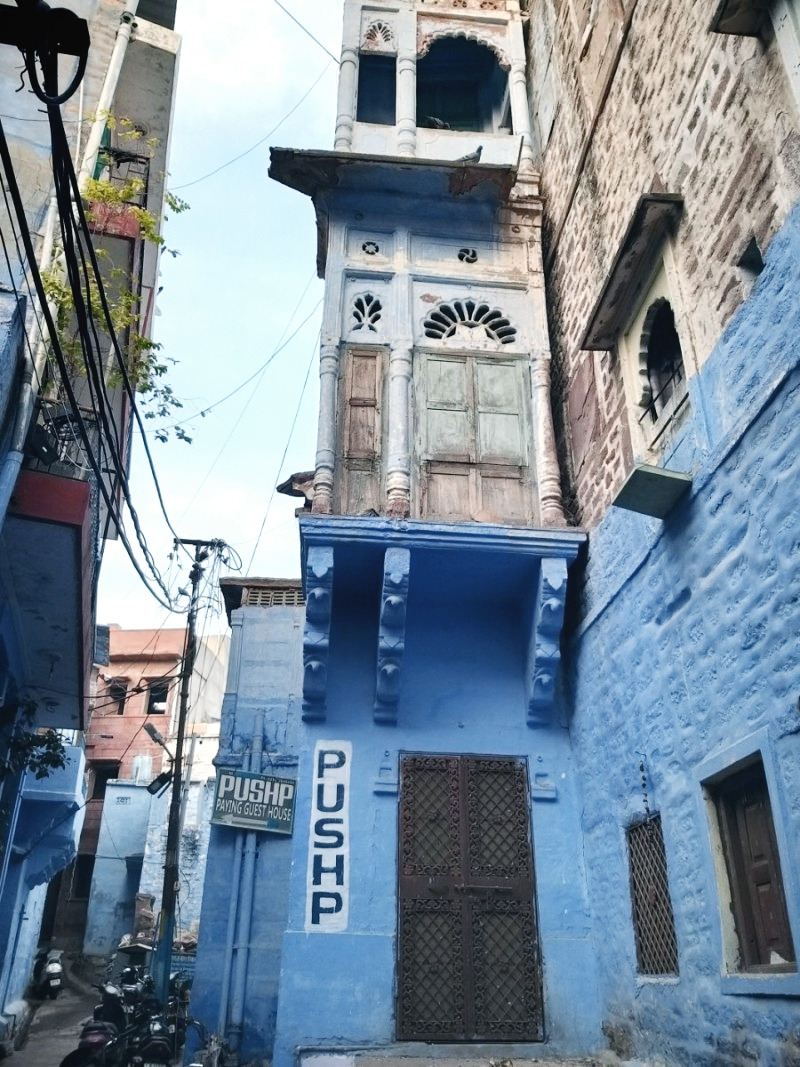 짐을 풀고 호텔을 찬찬히 둘러봤다. 분수대도 있고, 수영장도 있는 꽤 규모가 큰 주택이었다. 모든 바닥은 작은 타일로 모양을 냈고, 눈을 들면 메헤랑가르 성이 보이는 호텔의 루프탑은 아침에는 커피 한잔, 밤에는 맥주 한잔 하기에 그만일 것 같았다. 호텔을 둘러보면서 계단을 걸어 내려왔다. 어두워지기 전에 블루시티 골목을 걸어보려고 호텔 밖으로 나왔다.