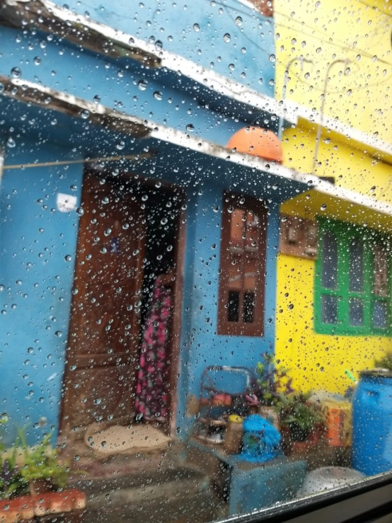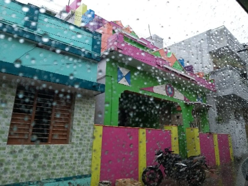 차창 밖의 비 내리는 깐얀꾸마리 마을은 너무나 황홀했다. 첸나이에 살면서 초록색 집도, 보라색 집도 더 이상 이상하게 보이지 않던 때가 있었다. 촌스럽다고 생각했던 알록달록 인도 집들은 어느 순간부터 내 눈에도 예쁘게 보이기 시작했다. 특히, 그날의 빗방울 너머 차창밖 풍경은 더할 나위 없었다.