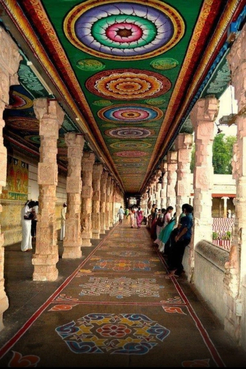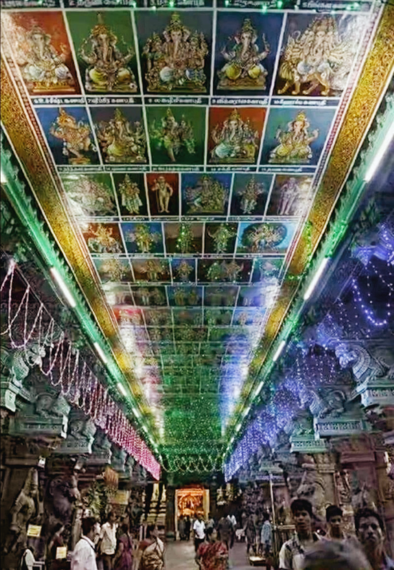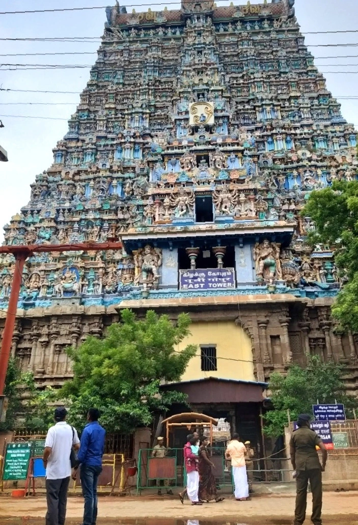 으스스하다 못해 신비롭기까지 한 상가 복도를 통과해서 나왔다. 어두운 복도를 지나서 나온 바깥세상에는 거대한 고푸람(gopuram : 사원 입구의 높은 문)이 시선을 압도했다. 상가와 템플 사이 길이 좁아서, 상가를 막 빠져나온 내 시야에 다른 것은 아무것도 보이지 않았고, 오로지 높고 크고 알록달록 수많은 힌두신들이 조각되어 있는 고푸람만이 가득 담겼다. 고개를 높게 쳐들어야 보이는 그것은 인도 최대 힌두 템플의 동문이었다.