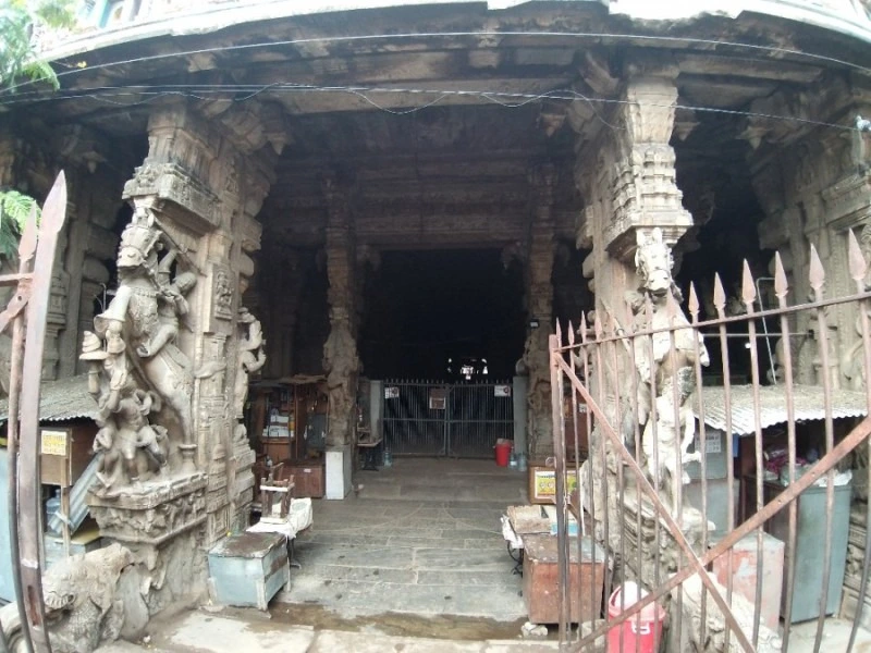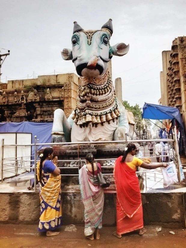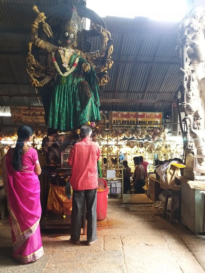 교통 체증을 뚫고 그리 멀지 않은 '미낙쉬 암만 템플'의 동문 쪽 어딘가의 아주 낡은 어느 템플 앞에 주차를 했다. 눈에 익은 힌두 신상 앞에는 출근길의 여자들이 기도 중이었는데, 그 소 동상 바로 앞 낡은 템플 안으로 통과하면 '미낙쉬 암만 템플'의 '동문'이 나온다고 존슨이 설명했다. 호텔 직원에게 주차할 장소와 우리가 갈 템플에 대해서 미리 정보를 얻어 온 존슨 덕분에 헤매지 않을 수 있었다.