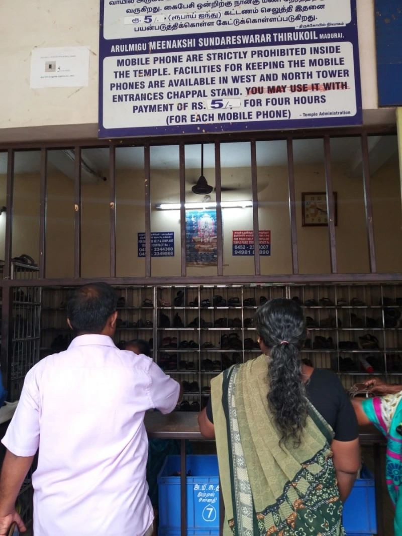실내 사진 촬영 금지라는 규정만으로도 부족한 지 카메라와 휴대폰을 입구에 맡기라고 했다. 인도 어디에서도 보지 못했던 그 장면은 마두라이 시민들이 그 템플을 얼마나 아끼는지 알 것 같았고, 템플 안 모습을 더욱더 궁금하게 했다. 대단한 보안과 대단한 관리에 놀라며 안으로 입장을 했다.