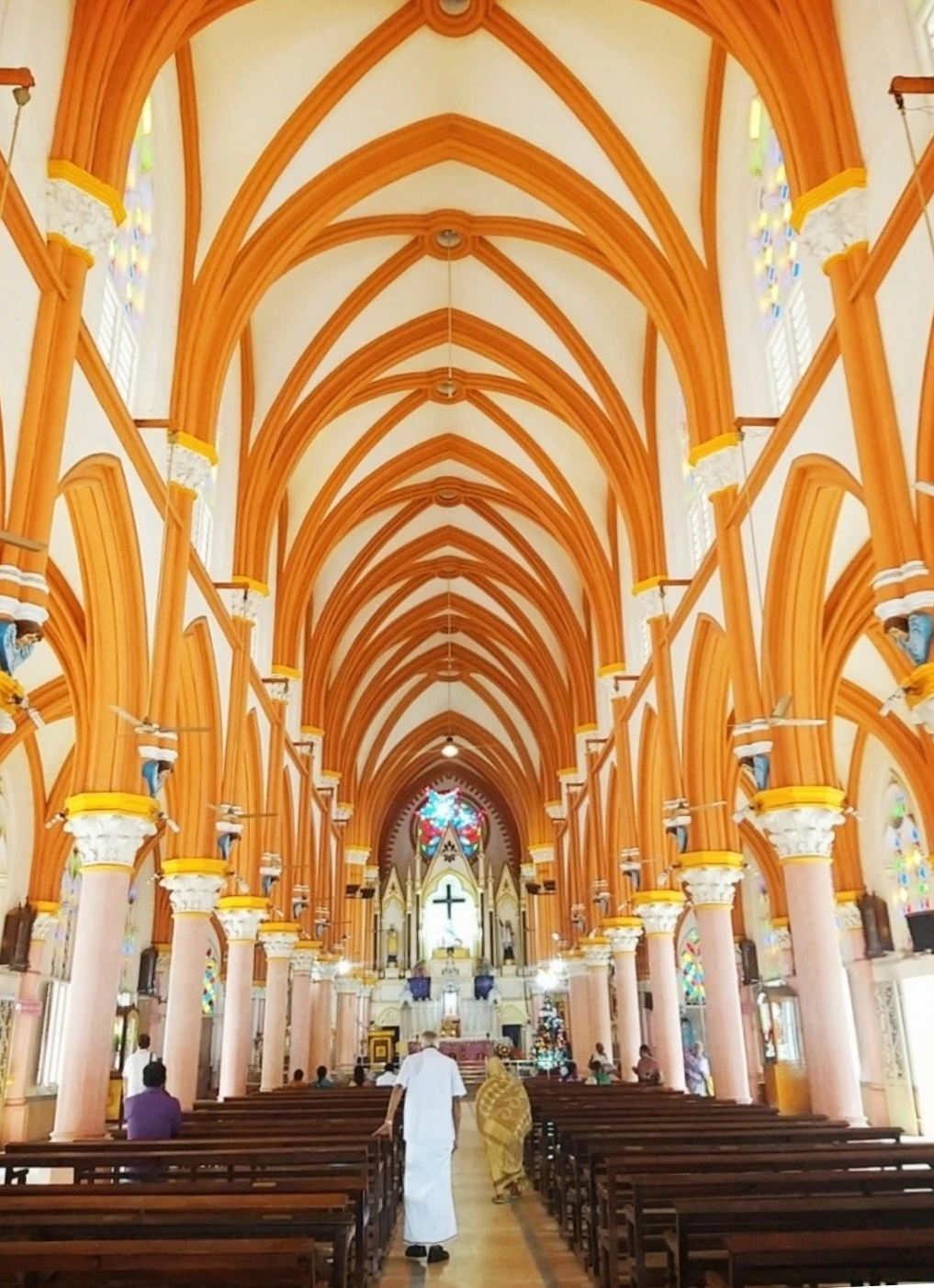 성 메리스 성당(st, marys church)에 다다랐다. 한눈에도 외관이 너무 예쁜 성당이었다. 퐁디셰리 외에는 그동안 내가 인도에서 본 성당들은 거의 대부분이 하얀색 페인트칠만 되어있었는데, 그곳의 성당은 흰색에 파란색 테두리가 칠해져 있어서 동화책 속의 예쁜 성처럼 보였다. 외관보다 성당 내부는 더 예뻤다. 흰색과 주황색의 조화는 눈이 부실 정도로 화려하고 아름다웠다. 자세히 들여다보니까 기둥은 모두 거대한 핑크색 대리석이었다. 연핑크 대리석 둥근기둥과 짙은 주황색 나무는 어울리지 않을 듯, 어울리며 너무나 근사했다. 흰색, 주황색, 핑크색의 조화는 화려하고 아름다웠다. 그 안에 앉은 기도하는 사람들까지도 성당 건물과 함께 하나의 예술품처럼 보였다.