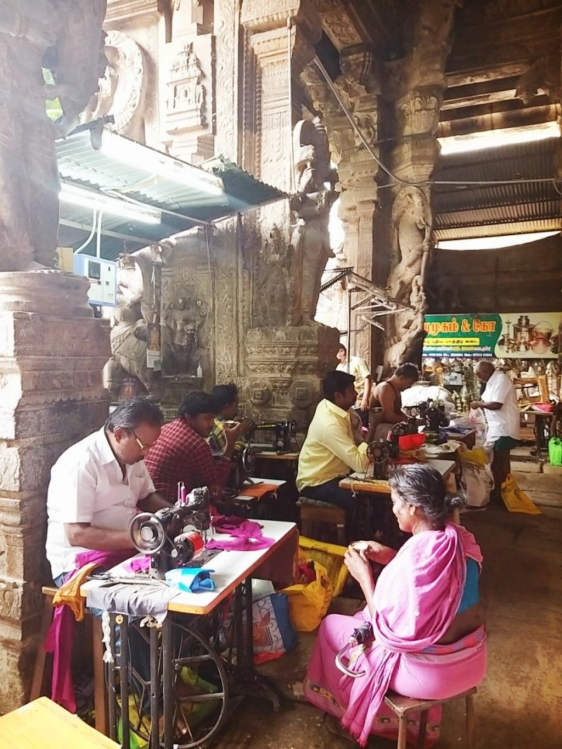 템플의 동문 쪽을 향했다. 주차된 곳으로 가려고 템플 동문과 마주 한 낡은 석조 상가 건물 안을 다시 통과했다. 문 닫힌 아침에는 으스스했던 그곳이 장사가 시작되니까 활기가 넘쳤고, 완전 다른 분위기가 되어 있었다. 조명이 켜졌고, 재봉틀 돌리는 소리와 상인들의 흥정하는 목소리가 긴 상가 복도에 쩌렁쩌렁 울렸다. 템플에서 그곳을 가게로 세를 놓았고, 그 가겟세로 '미낙쉬 암만 템플'의 관리 비용으로 사용한다고 했다. 그래서 입장료가 없었던 것이었다. 참 좋은 아이디어라는 생각을 했다.