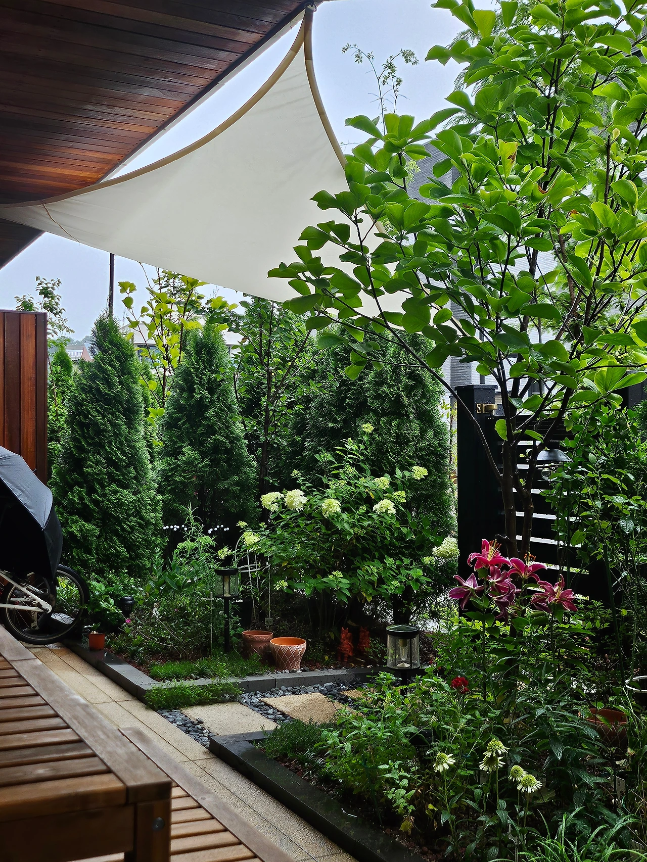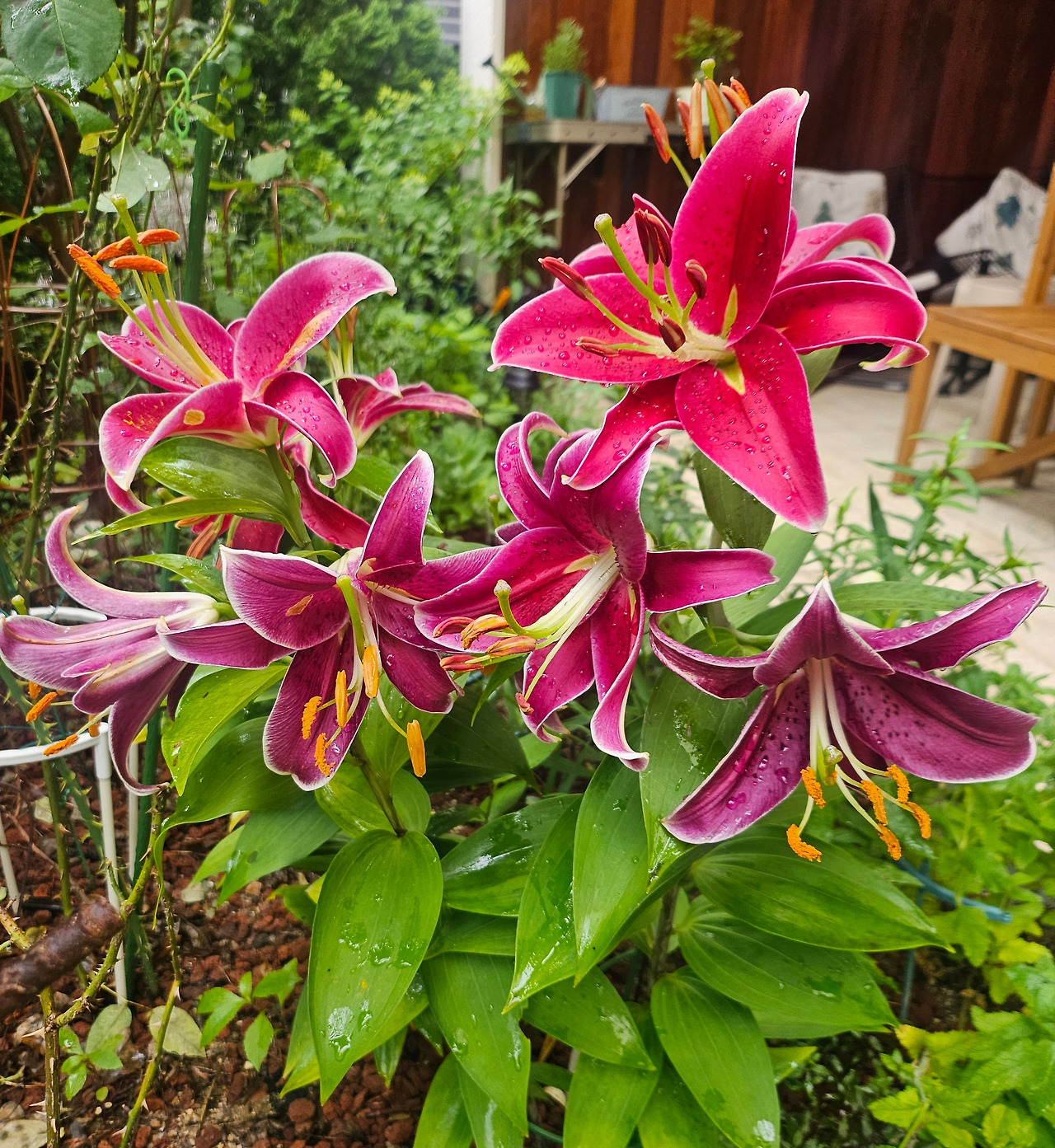 화려한 봄꽃들이 더위와 장마를 못 견디고 모두 시들고 말았다. 인내하던 붉은 백합이 그제야 보란 듯이 펴서 초록 정원을 강한 색과 향기로 가득 덮고 있다.