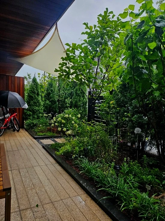 여름의 끝자락, 작은 정원은 햇볕과 비를 여름 내내 풍족하게 맞아서 초록 식물이 정원에 넘치게 자라 있다.