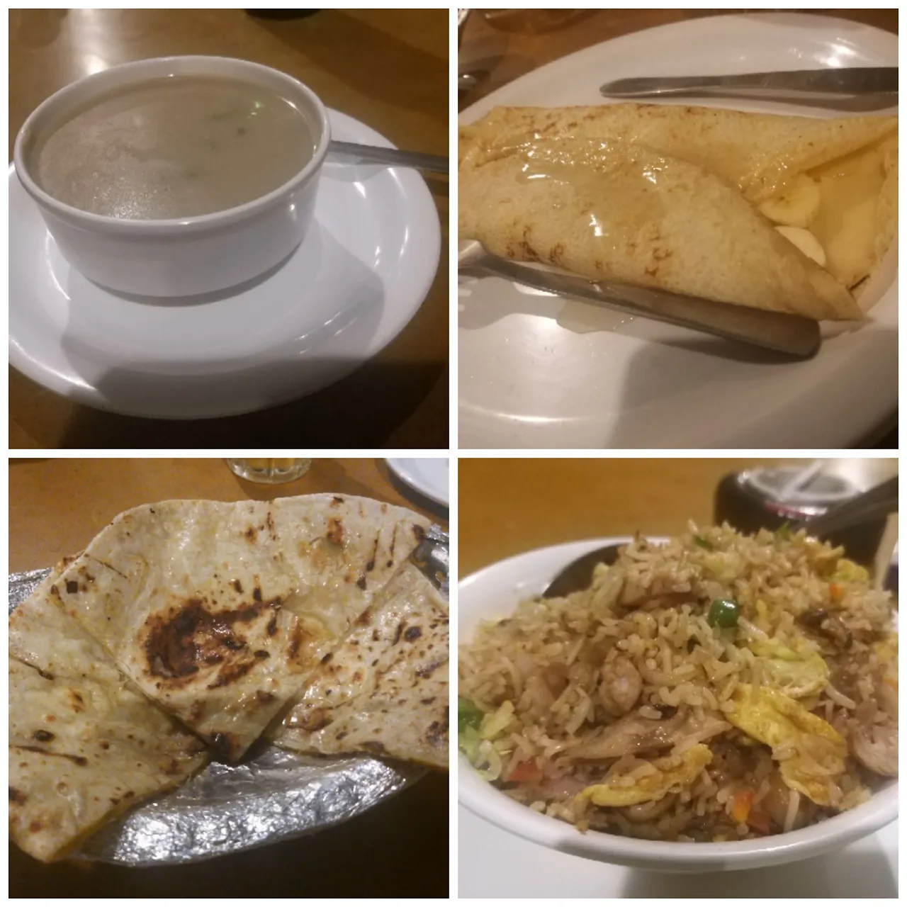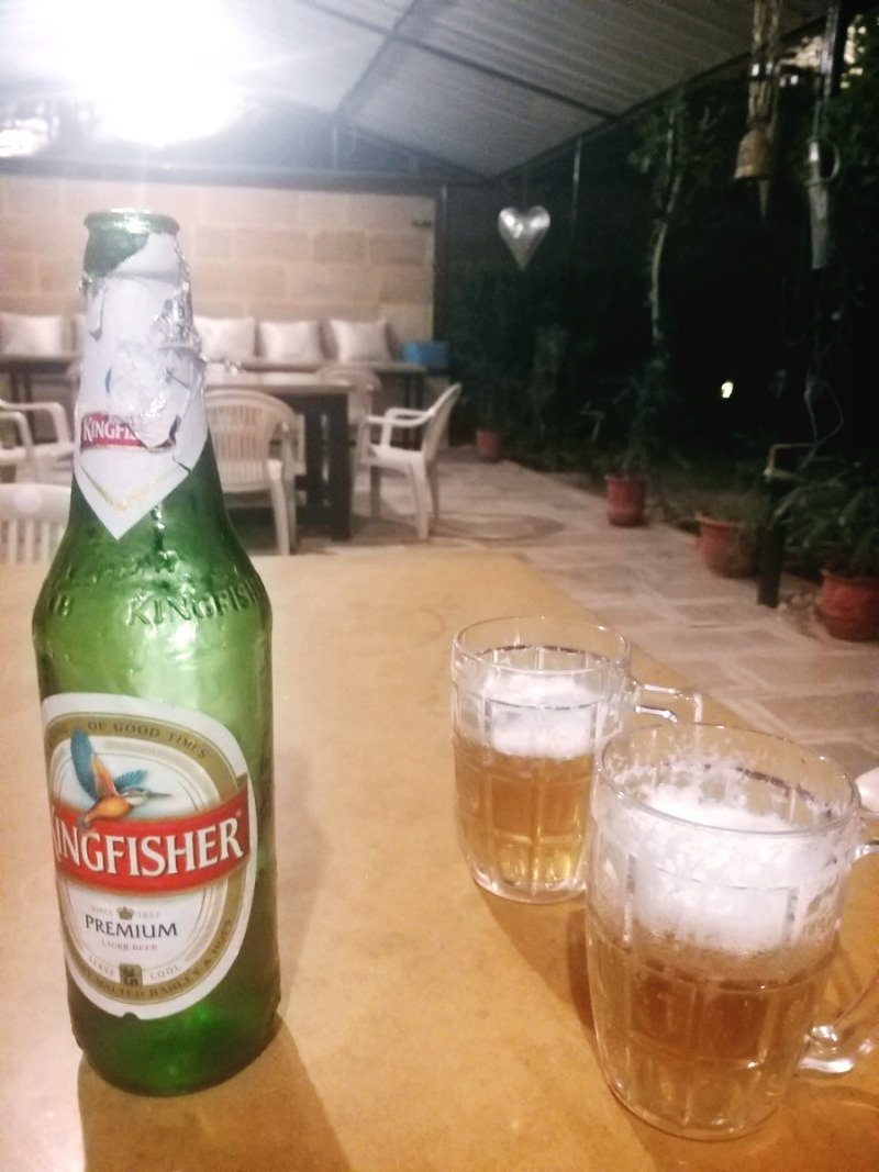 야외 식당이 너무 추웠지만 그 밤에 다른 식당을 찾을 수도 없어서 호텔 식당에서 벌벌 떨면서 저녁을 먹었다. 따뜻한 양송이 수프와 난과 볶음밥과 킹피셔도 한병 주문했다.