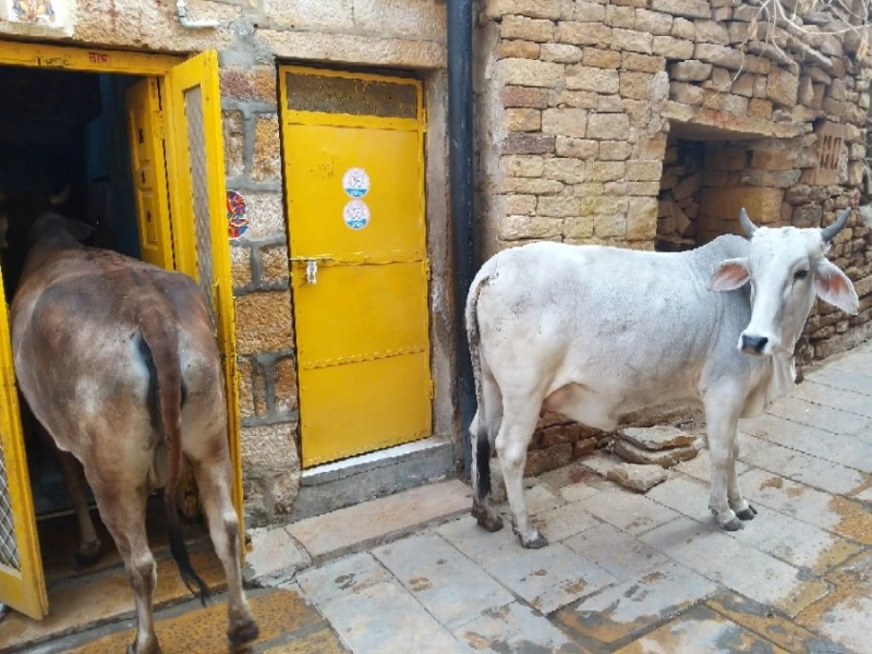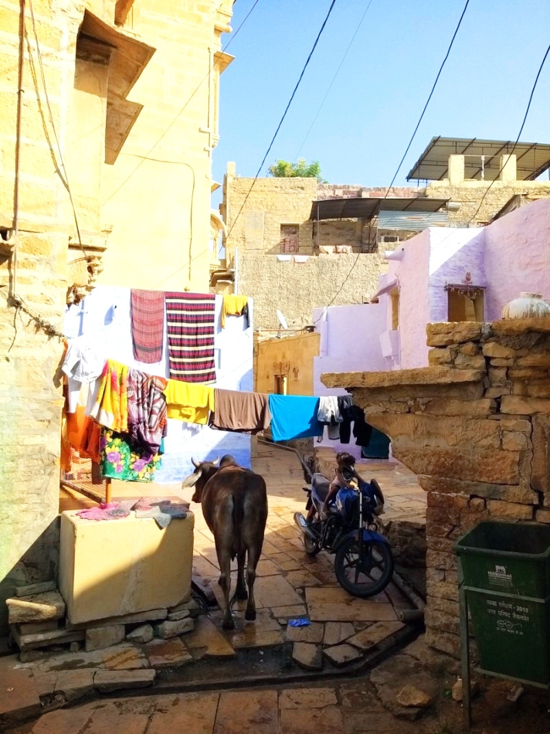 다소 복잡했던 초입의 가게 골목을 지났더니 노란색의 화사한 다른 분위기의 골목이 나타났다. 아침 햇살에 비치는 노란색 집들이 너무 예뻤다. 집 앞에 널린 빨래들도 먹을 걸 찾아서 골목을 떠도는 소들도 노란 집들과 함께 현실이 아닌 동화 속의 한 장면 같았다. 컬러감에서 오는 환각 증상 같았다.