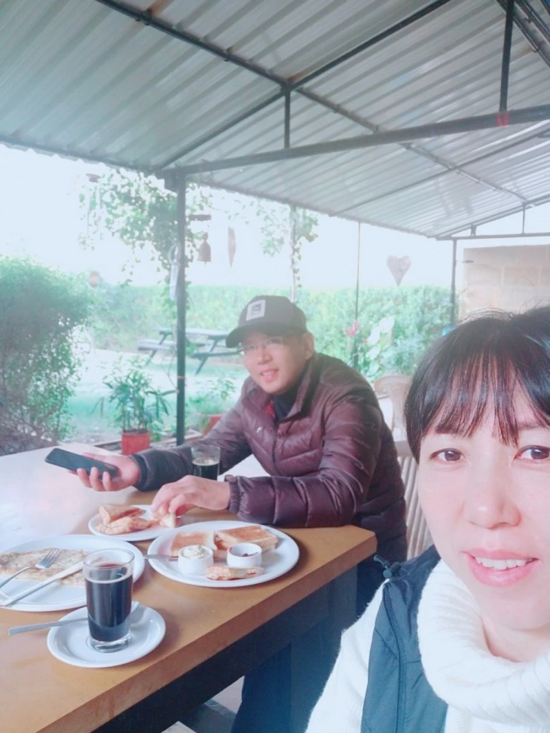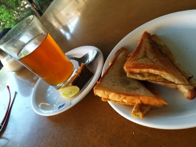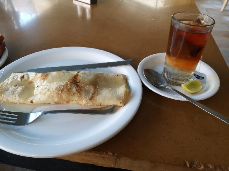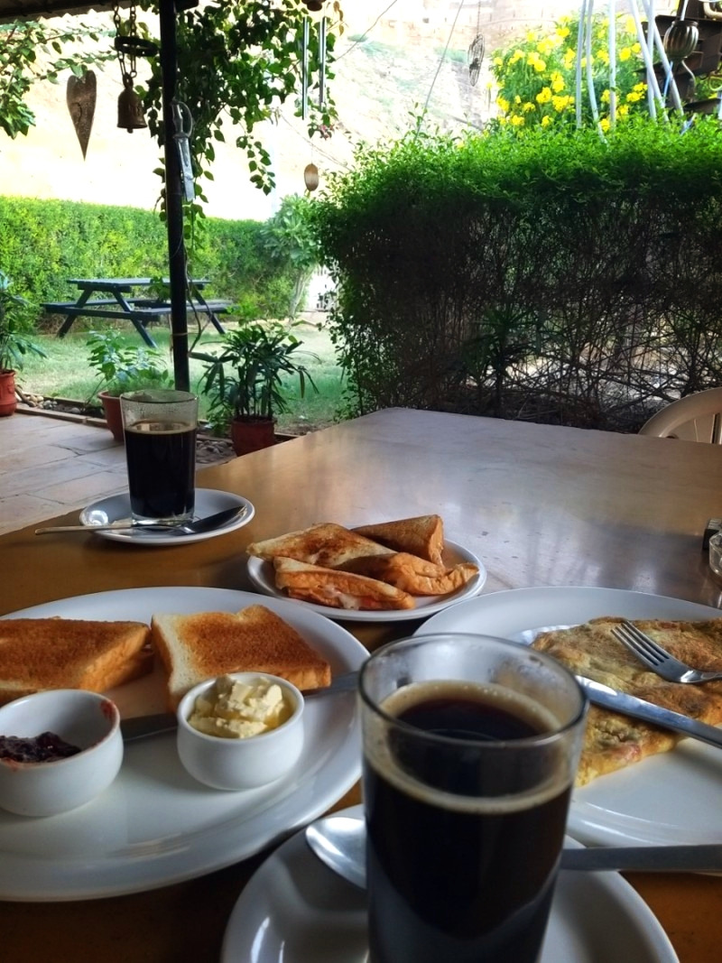 아침에도 전날 저녁때와 마찬가지로 야외 테이블에 앉아서 오더 메뉴로 식사를 했다. 저녁때보다 더 추운 야외 테이블이었다. 유리컵에 부어 주는 뜨거운 블랙커피와 잼과 버터가 있는 토스트 식빵과 오믈렛과 토마토 치즈 샌드위치가 우리의 메뉴였다. 토마토 치즈 샌드위치가 딱 우리 취향이었다. 쓴 커피와 너무 잘 맞는 아침 메뉴였다. 이후로도 우리는 자이살메르에 머무는 내내 같은 메뉴를 선택했다.