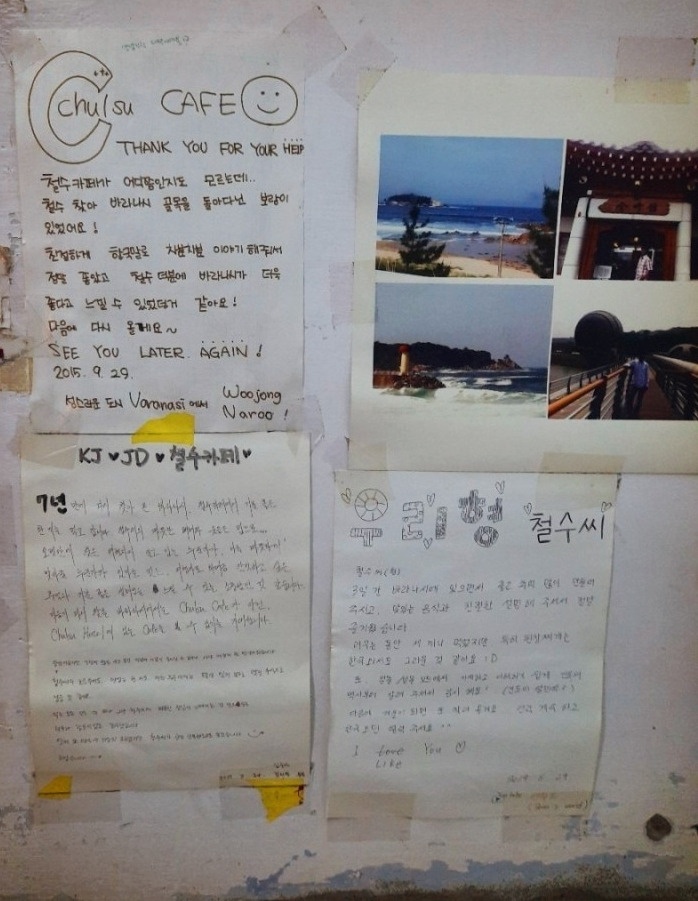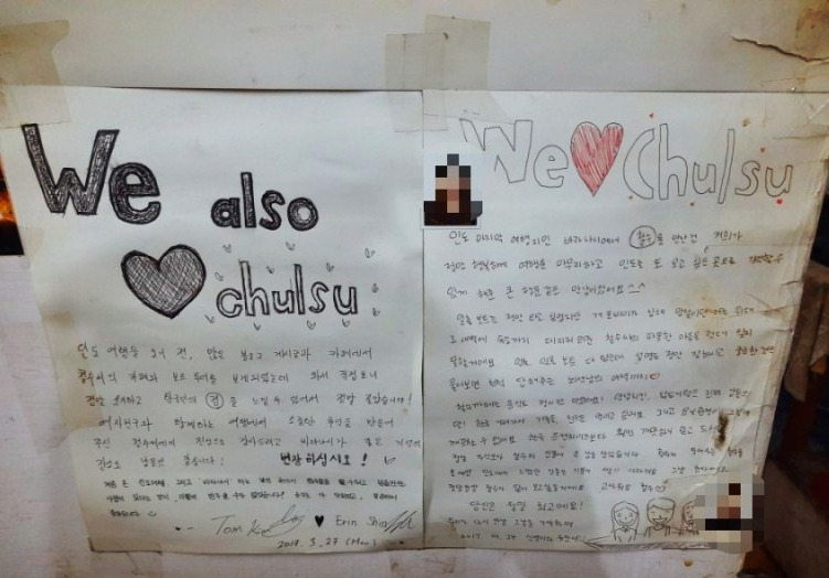 생각보다 더 좁고 허름한 식당이었다. 벽에는 없는 게 없는 한국음식 메뉴판이 걸려있었고, 철수 씨 사진과 한국 여행객들이 남긴 철수 씨에 대한 고마움이 담긴 손편지들이 붙어있었다.