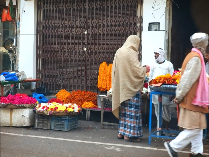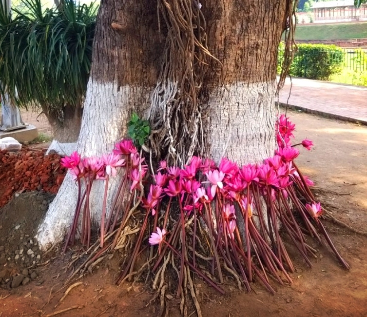 사르나트 발굴지에 들어섰더니 큰 보리수나무 아래에 예쁜 꽃들이 많이 놓여있었다.