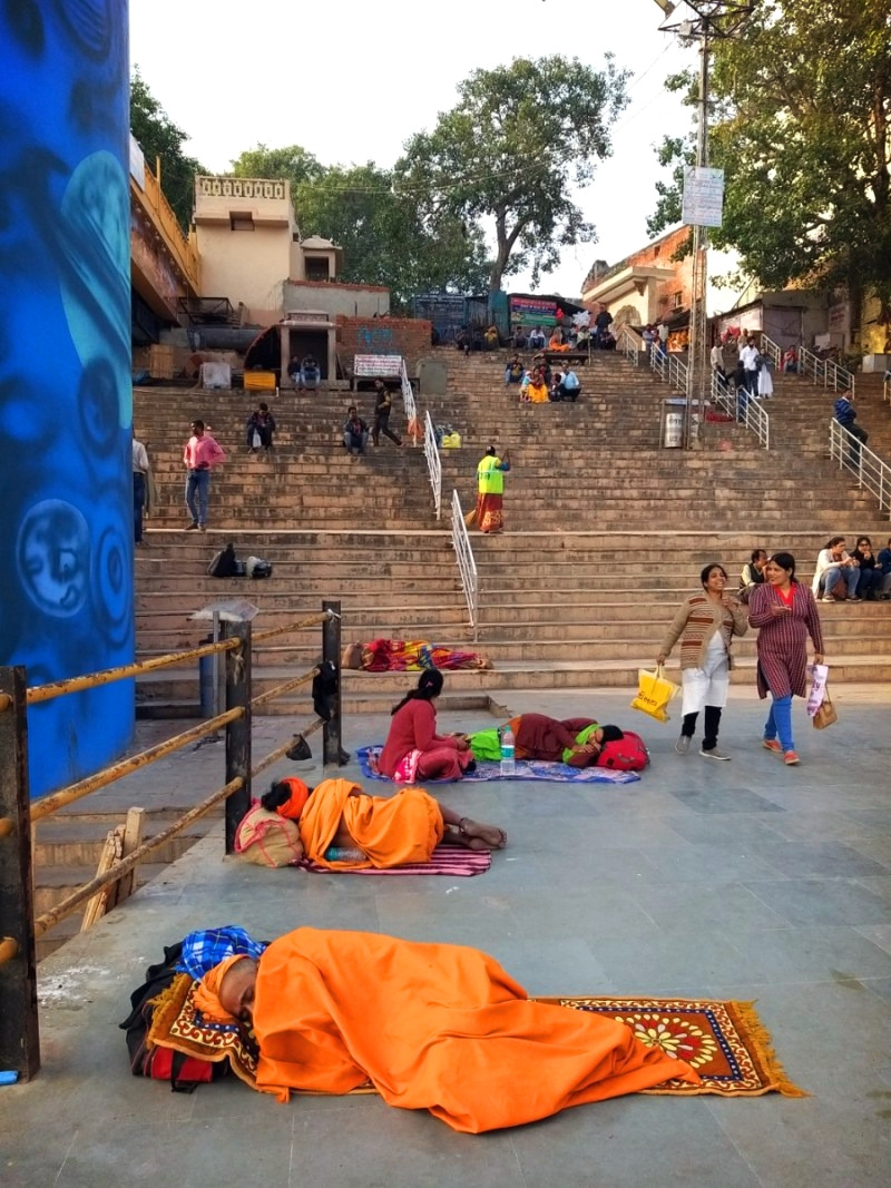 걷다 보니 강이 보였다. 대낮의 갠지스강 주변 풍경은 아침과는 또 달랐다. 오히려 조용했고, 사람들도 아침에 비해서 많지 않았다. 가트 계단에 앉아서 쉬는 사람들, 바닥에 누워서 자는 사람들이 많이 보였다.