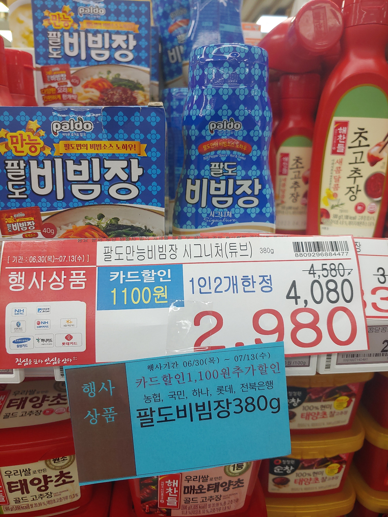 "1인 두 개 한정으로 팔도 비빔장을 반값에 팔더라고!"