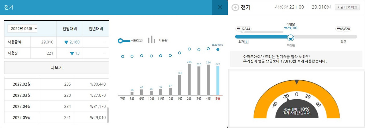 더위 대응 기본 원칙을 세워 에어컨 가동을 줄이면 자연스레 전기 요금도 적게 나온다. 4인 가구인 우리 집은 전용 면적 96제곱미터의 아파트이다. 동일 면적 평균보다 약 20% 정도 사용량이 적다. 아파트 관리비 사이트에서 통계를 확인해 보니 지난 6개월 간 전기 사용량이 다른 집보다 확연히 적었다. 집에 머무는 시간이 많은 집돌이, 집순이 라이프 스타일을 감안하면 꾸준히 선방하고 있다.