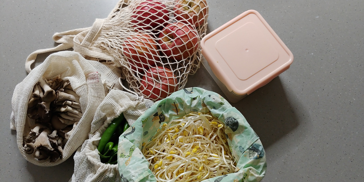 몇 가지 천주머니와 저장 용기만 있으면 포장지 없이 식재료 구입이 가능하다.