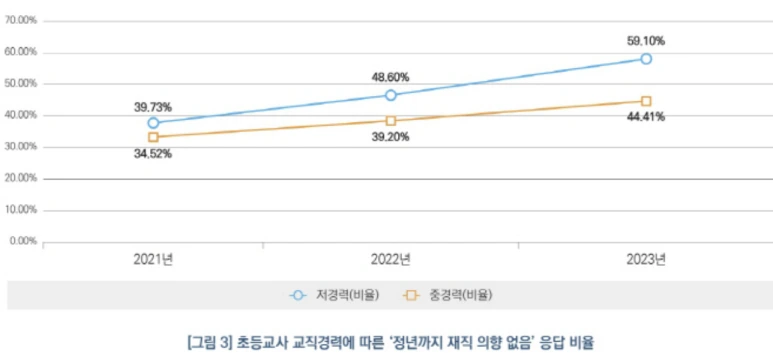해당 보고서에 따르면 교직 경력이 5년 미만인 저연차 교사 중 교직 이탈 의향이 있다고 응답한 교사가 지난해 59.1%로 나타났다.