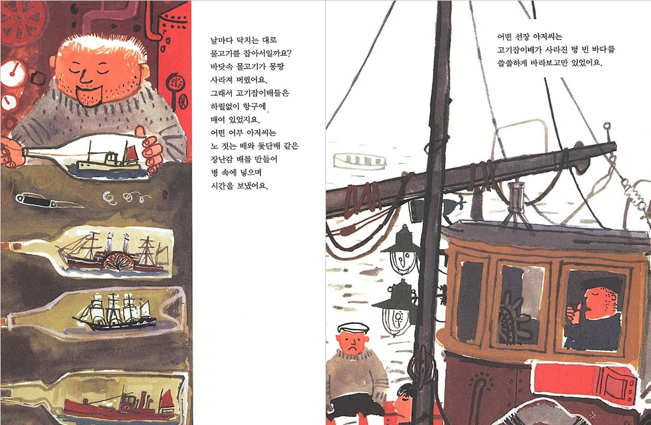 맥 아저씨가 빈정대자 주변에 있던 사람들이 깔깔댄다. 그들은 최신식 탐지기를 앞세워 닥치는 대로 물고기를 마구마구 잡아 올린다. 촘촘한 그물코로 치어들까지 깡그리 잡아서일까? 바닷속 물고기가 몽땅 사라져 버린다. 마을의 고기잡이배들은 하릴없이 항구에 매여 있다.