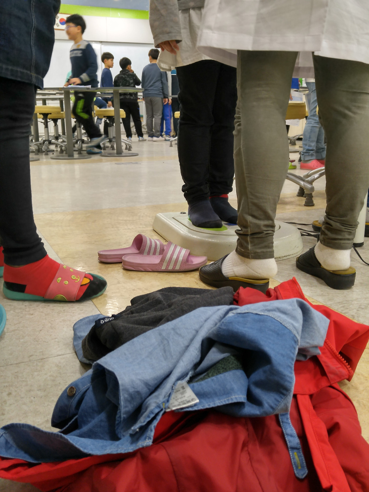 얇은 청자켓과 검은 카디건, 가벼운 바람막이 점퍼가 바닥에 나뒹굴었다. 모두 여자아이들의 옷이었다. 식판에 담긴 떡이 급식 테이블에 떨어져도 더럽다고 안 먹는 깔끔쟁이들인데 의외였다. 마침 승현이가 낑낑거리며 멜빵 치마를 벗으려길래 급히 다가가 말렸다.