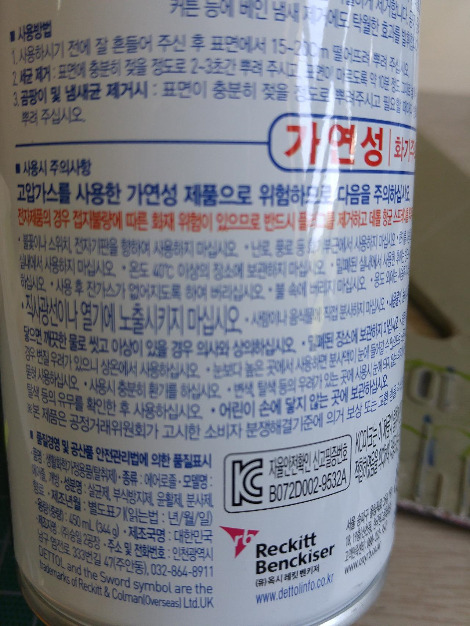 데톨 향균 스프레이를 석율이에게 줬다. 코 앞까지 가져가야 보이는 작은 글씨를 읽어보라 하였다. 석율이는 '사용시 주의사항'을 유심히 보았다.
