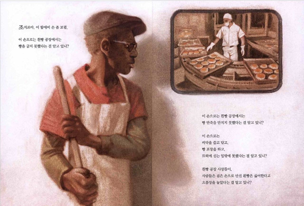 다시 [할아버지 손]으로 돌아가 보자. 조지프가 할아버지에게 직접 전수받지 못한 기술이 딱 하나 있다. 검은 손손은 허락되지 않았기에, 할아버지가 배우지 못한 빵 반죽 만지고 굽는 일이다. 다른 건 몰라도 빵은 조지프가 할아버지보다 한 수 위다. 자유와 권리가 보장된 시대에 태어난 손자는 빵 반죽 만지기를 두려워하지 않는다. 조지프가 두 손으로 직접 만든 먹음직스런 빵을 보며 할아버지는 읊조린다.