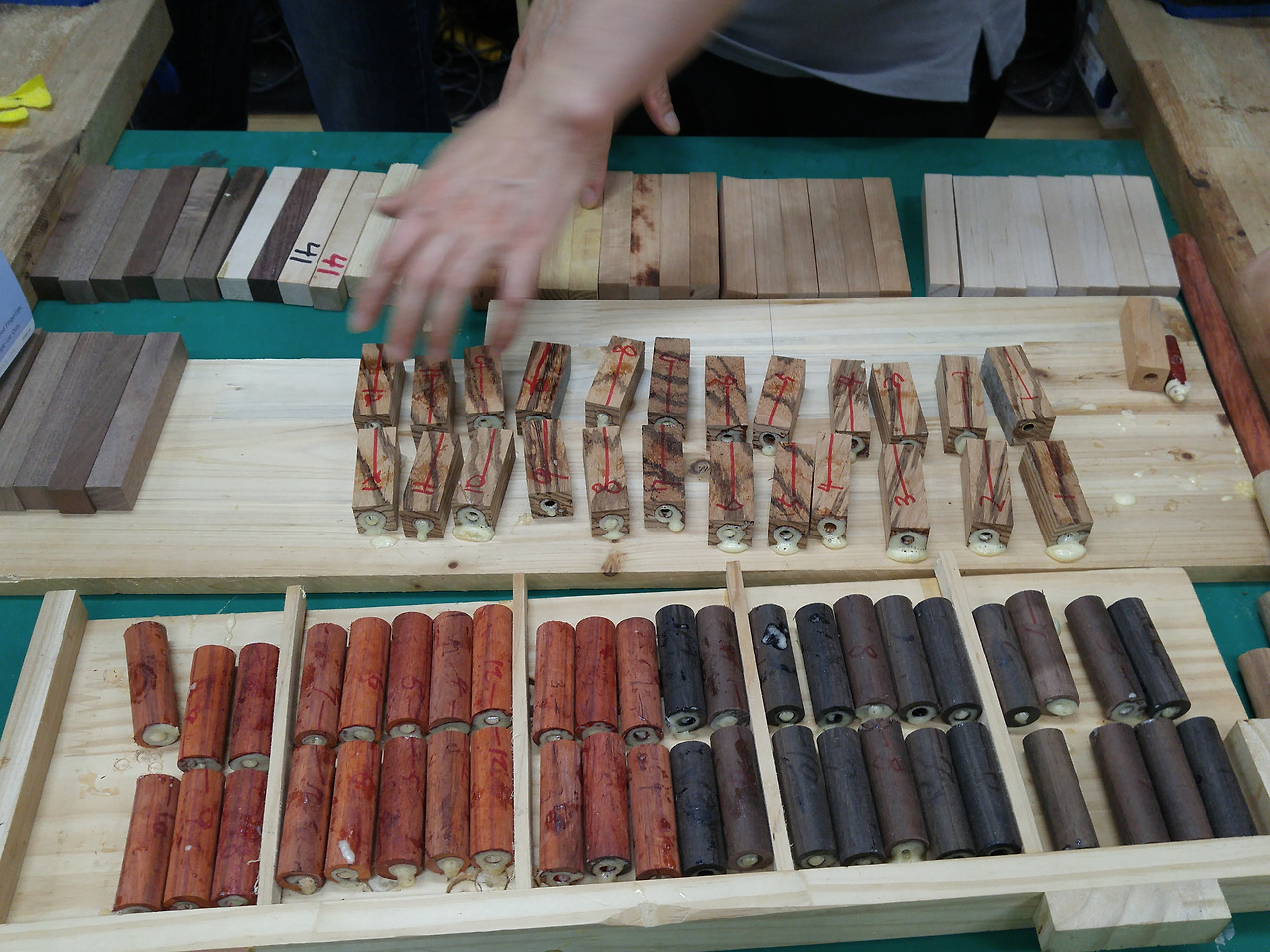이번에 참여한 우든펜 수업은 잉크나 펜촉까지 개발하는 것은 아니고, 펜 키트를 감싸는 몸통 부위를 제작하는 과정이었다. 작업실에 들어가니 책상 위에 세 가지 종류의 나무토막이 준비되어 있었다. 원통 모양에 붉은기가 도는 파덕, 직육면체 모양에 검은 줄무늬가 밝은 갈색 바탕 위를 가로지르는 제브라 우드, 진한 초콜릿 색에 나뭇결이 선명한 로즈우드였다. 따뜻한 색감의 파덕을 선택했다.