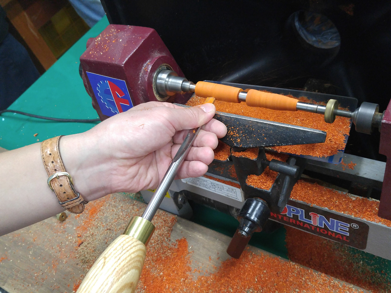 전원을 켜자 엄청난 속도로 나무가 돌기 시작했다. 손잡이가 긴 가우지 칼을 회전체 아래에 밀어 넣자 칼이 들어간 깊이만큼 목재가 파였다. 드릴 작업과는 비교가 되지 않는 굉음이 울리고 나무 향이 훅 끼쳤다. 다홍색 파덕 나무 조각들이 폭발하듯 튀었다. 너무 힘을 세게 줘서 그렇다고 조언을 들었다. 자칫하면 재료가 쪼개질 수 있으니 바깥쪽부터 천천히 들어가기로 했다.