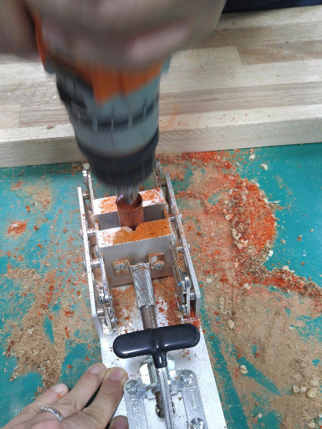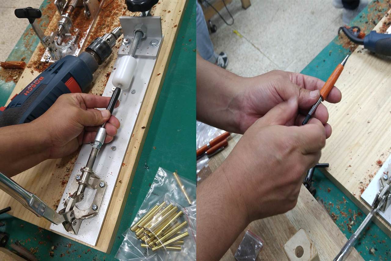 뚱하게 서있는데 아쉬워할 틈도 없이 드릴이 투입되었다. 어느 눈치 빠른 사람이 내 마음을 읽고 준 줄 알았는데 알고 보니 황동 튜브와 블랭크의 높이를 맞추기 위함이었다. 윙~ 윙 ~ 모터음과 함께 드릴 축이 시계방향으로 빠르게 회전했다. 목재를 바이스에 야무지게 고정시킨 후 수직으로 드릴을 꽂았다. 드르륵드르륵 체중을 실어 내리누르자 트리머라 불리는 둥근 쇠톱이 톱밥을 튕겨냈다.